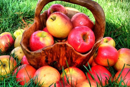 Korb mit Äpfeln auf grünem Gras