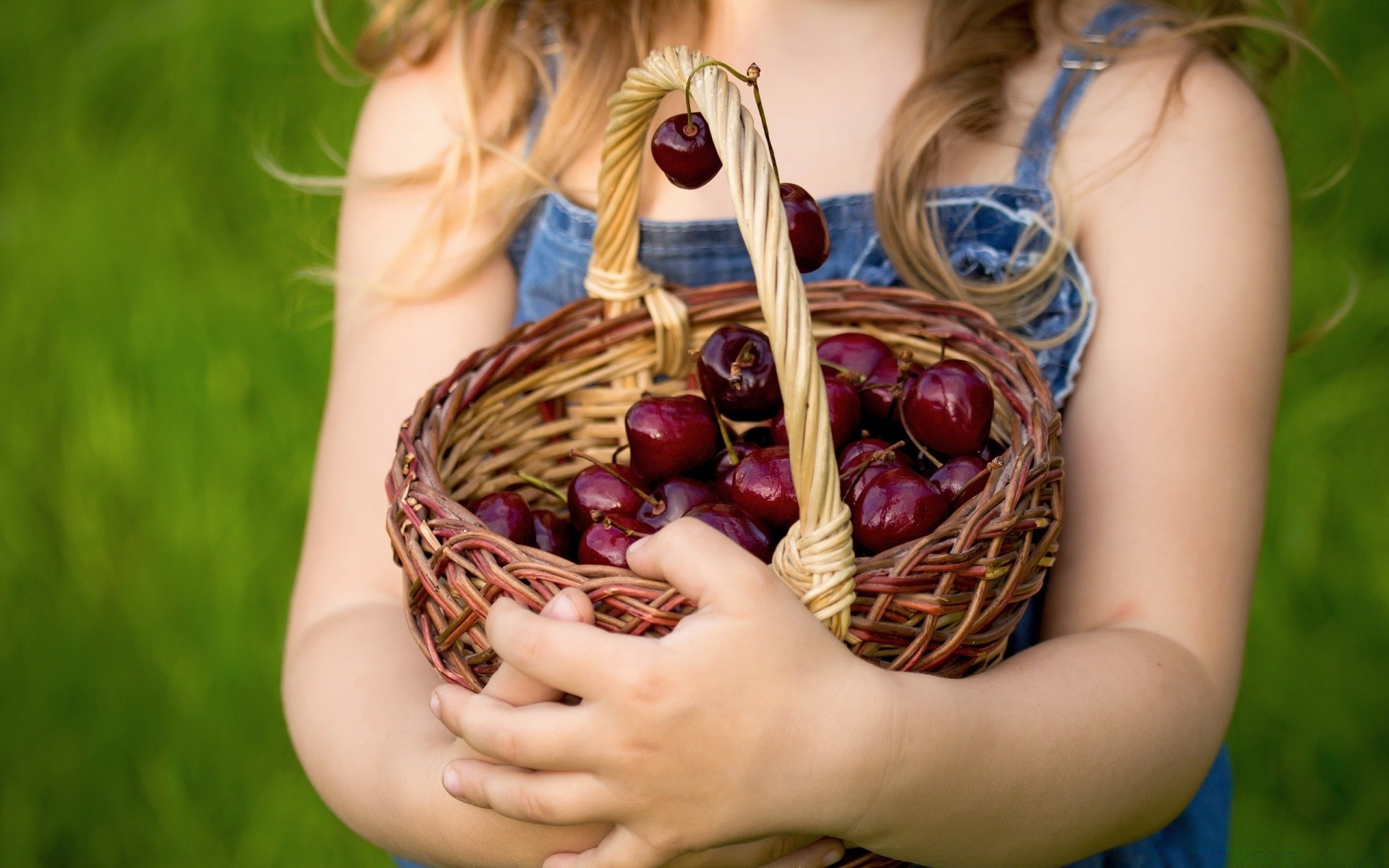 Mädchen mit einem korb mit kirschen auf grünem gras hintergrund