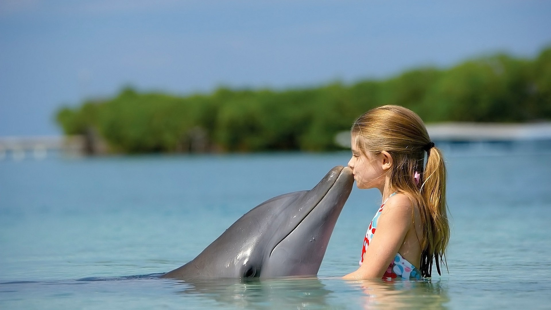 Ein Mädchen mit einem Delphin. Sommer. Die Natur
