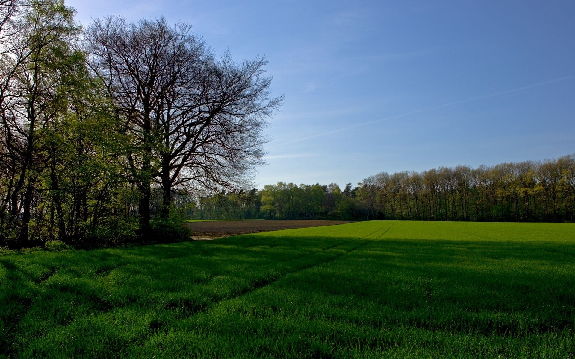 Natur, Feld, saftiges Gras umgeben von Wald