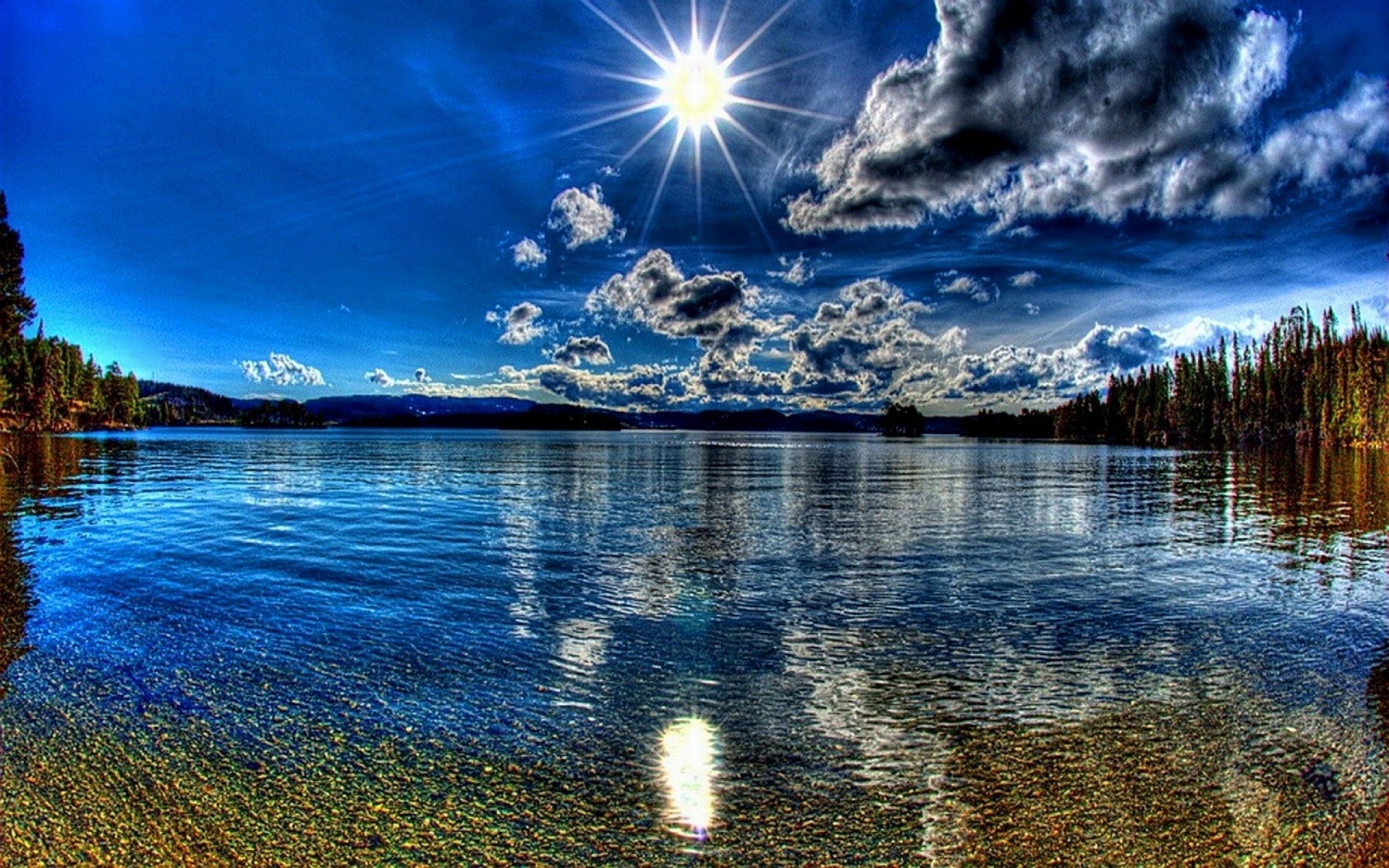 Kontrastreiche Seenlandschaft bei Sonnenuntergang