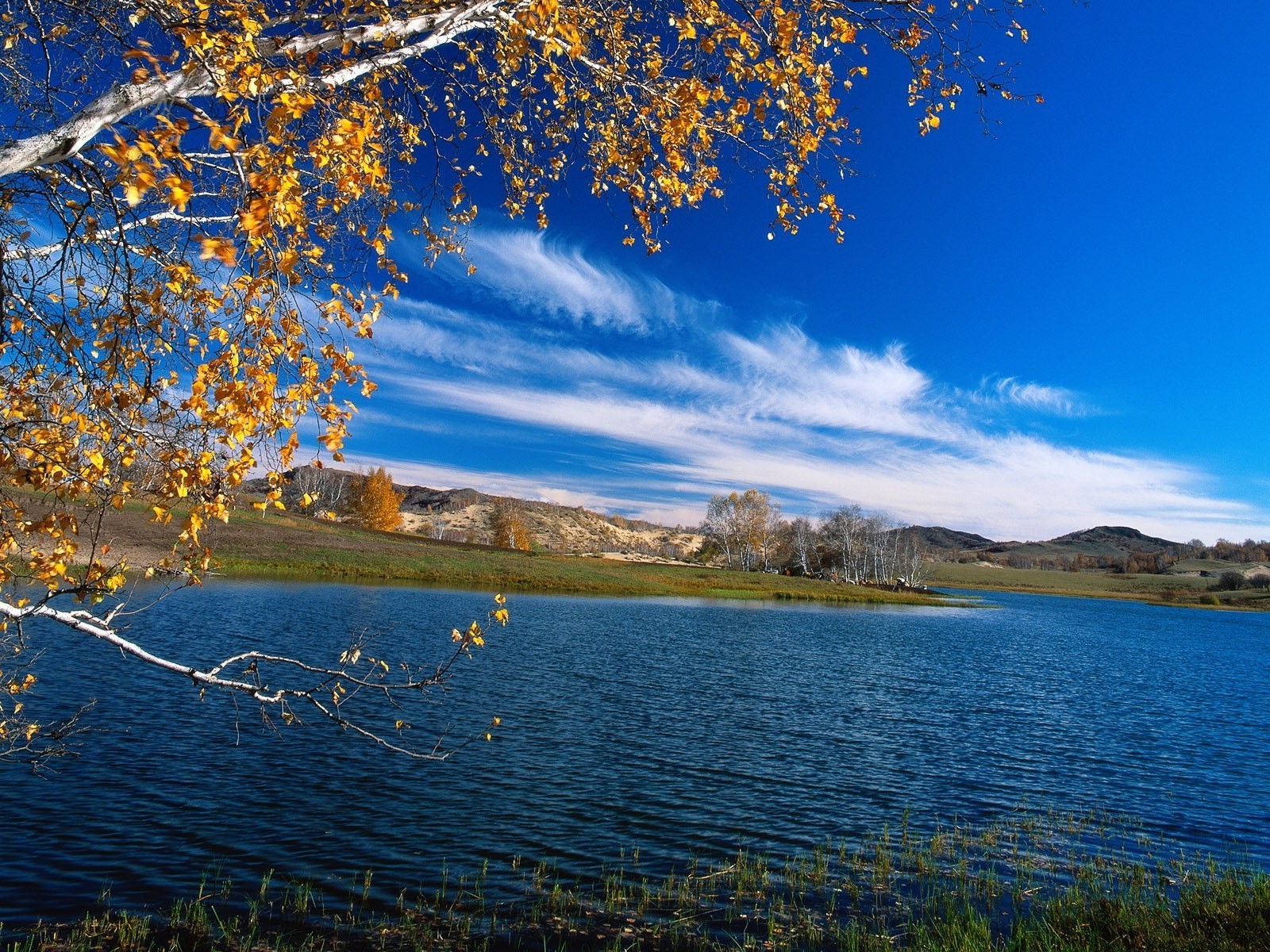 Eine fast gefallene Birke hat sich über den Fluss gebeugt