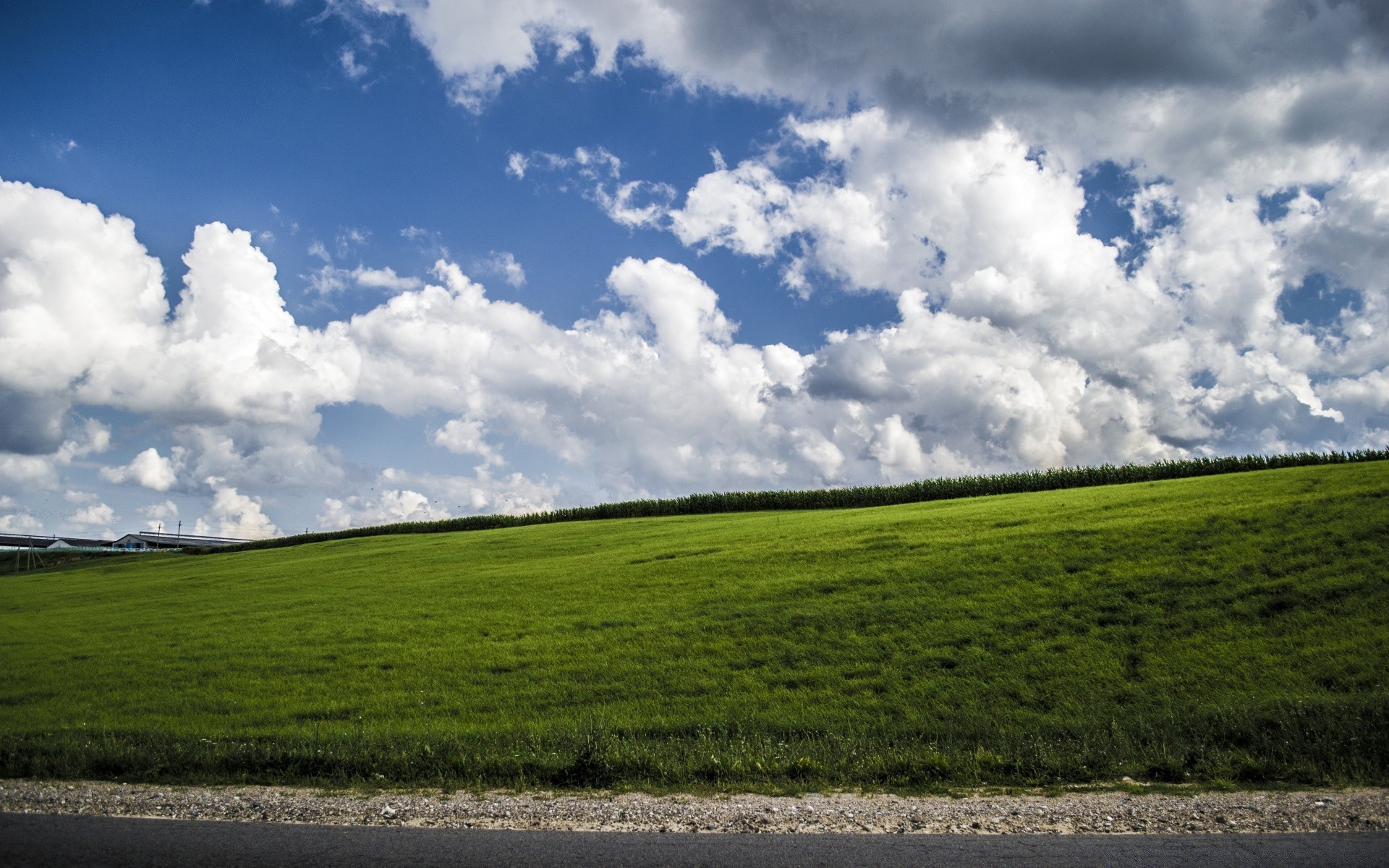 Helle grüne Wiese vor dem Hintergrund eines blauen bewölkten Himmels