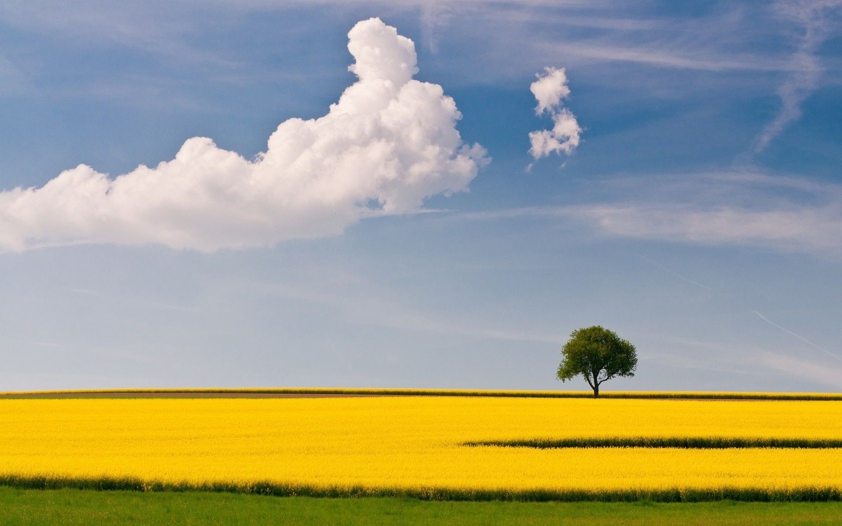 Gelbes Feld und Baum auf blauem Himmelshintergrund