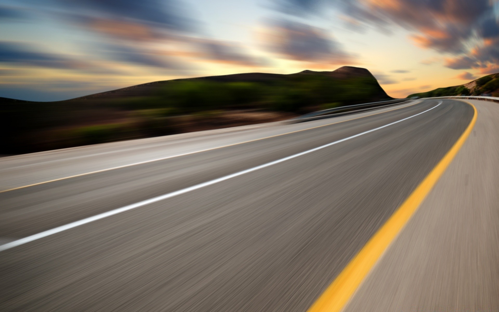 Eine weit entfernte Autobahn bei Sonnenuntergang inmitten grüner Vegetation