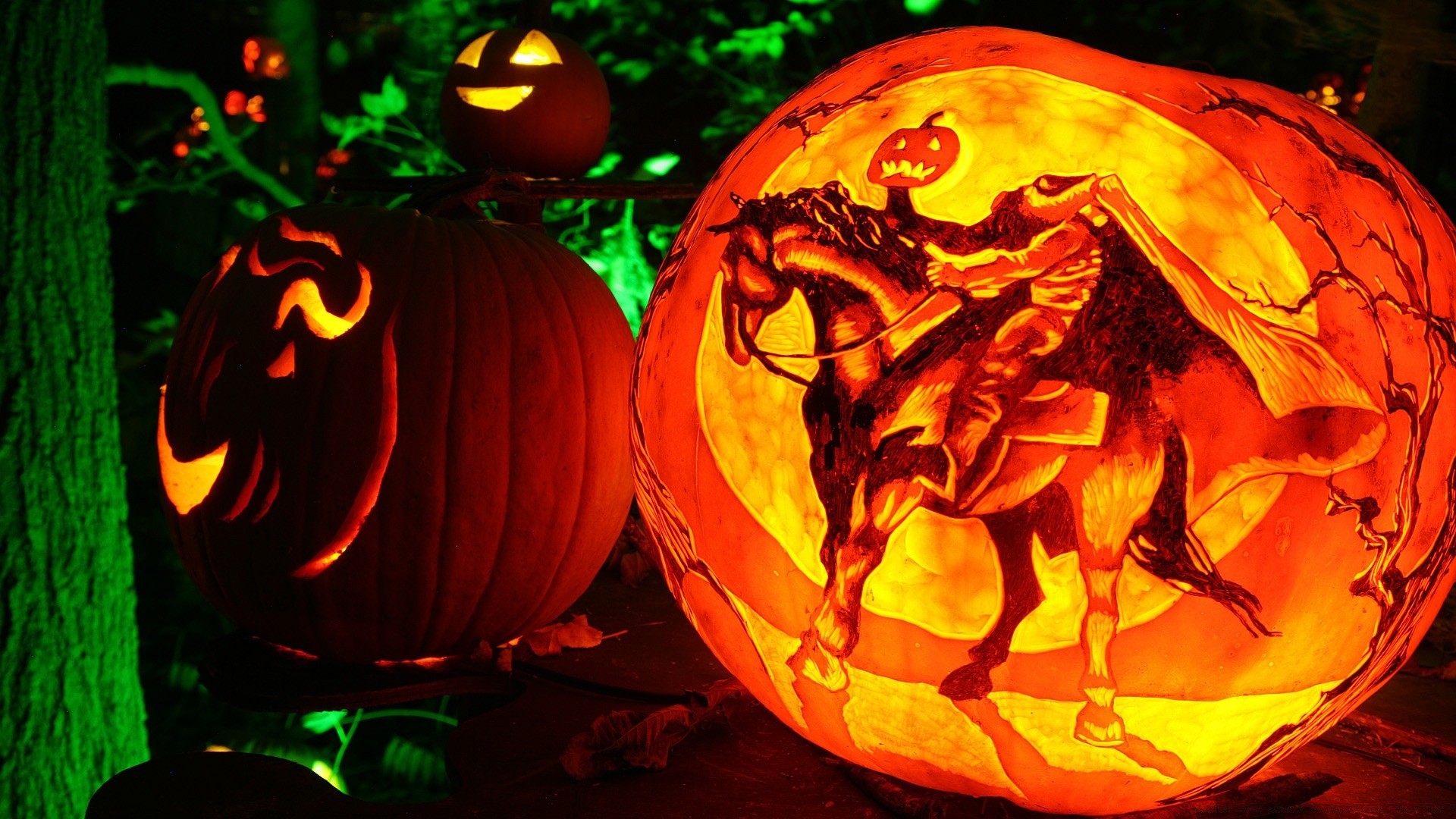 Zu Halloween geschnitzte Kürbisse, die in der Nacht leuchten