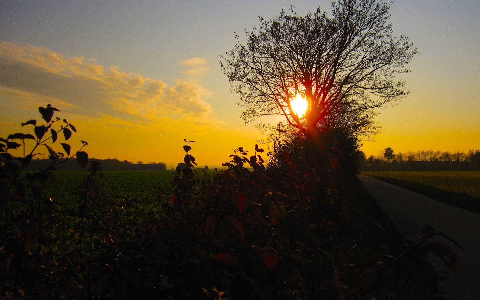 Die Sonne geht unter und der Baum schließt ihn