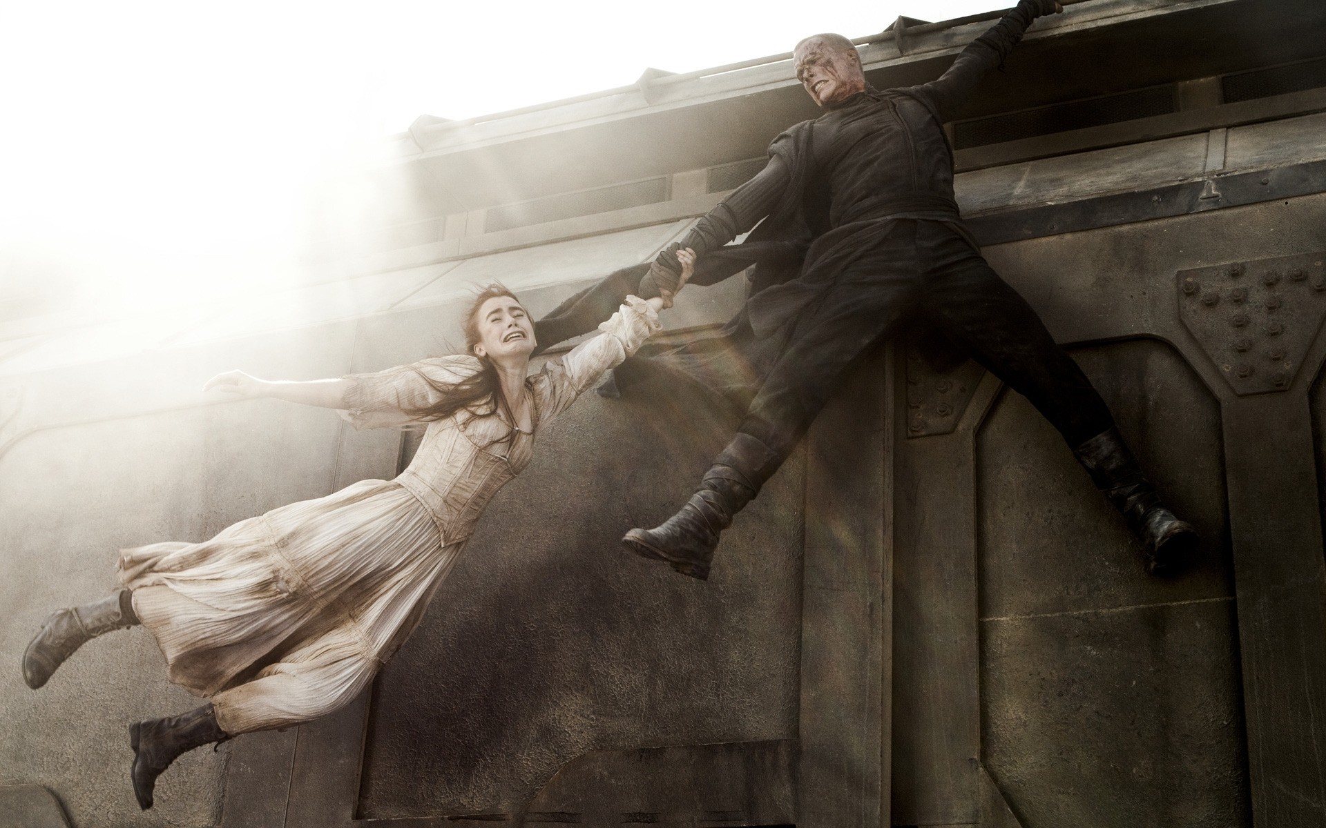 Unglaubliche Szene im Film vor dem Hintergrund eines Wolkenkratzers