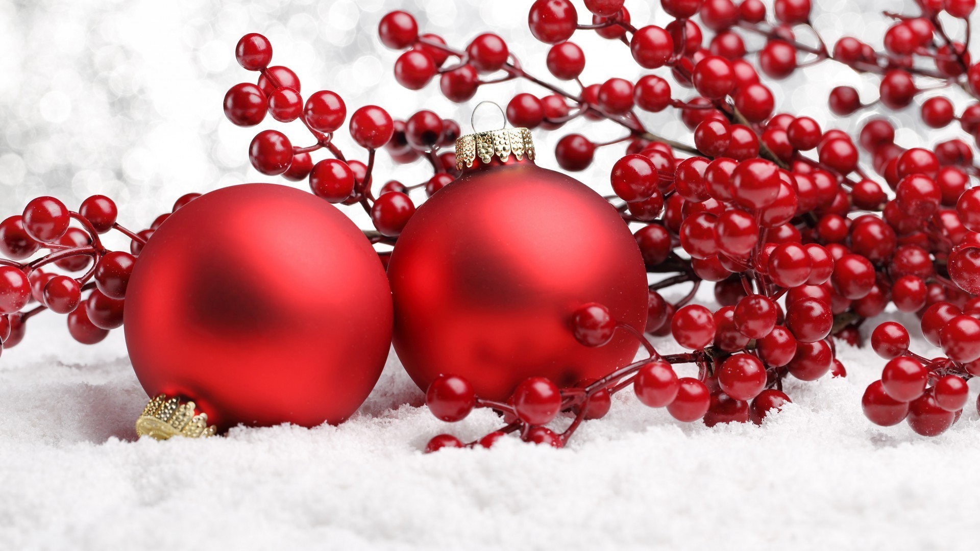 Rote Weihnachtskugeln auf einem Hintergrund von roten Beeren
