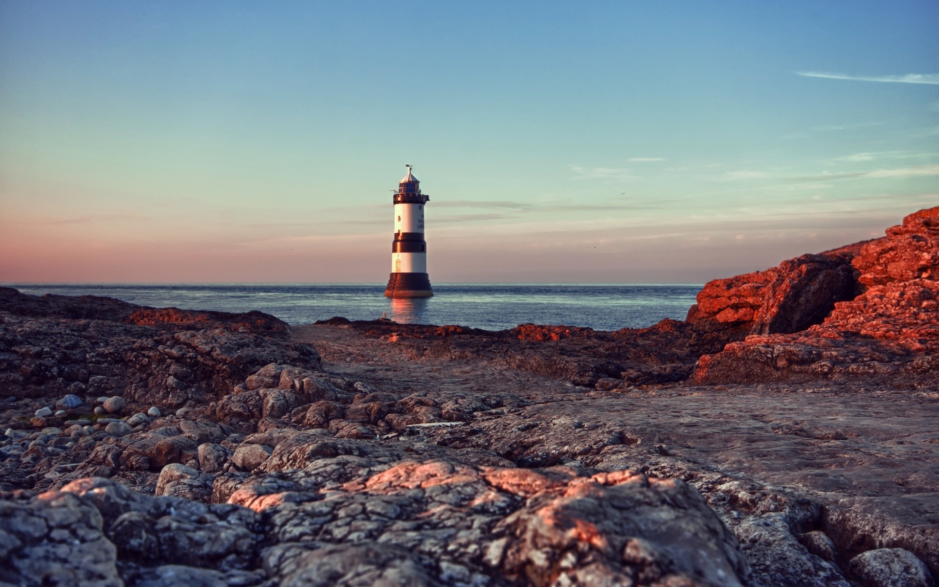 Leuchtturm im Meer vor Sonnenuntergang Hintergrund