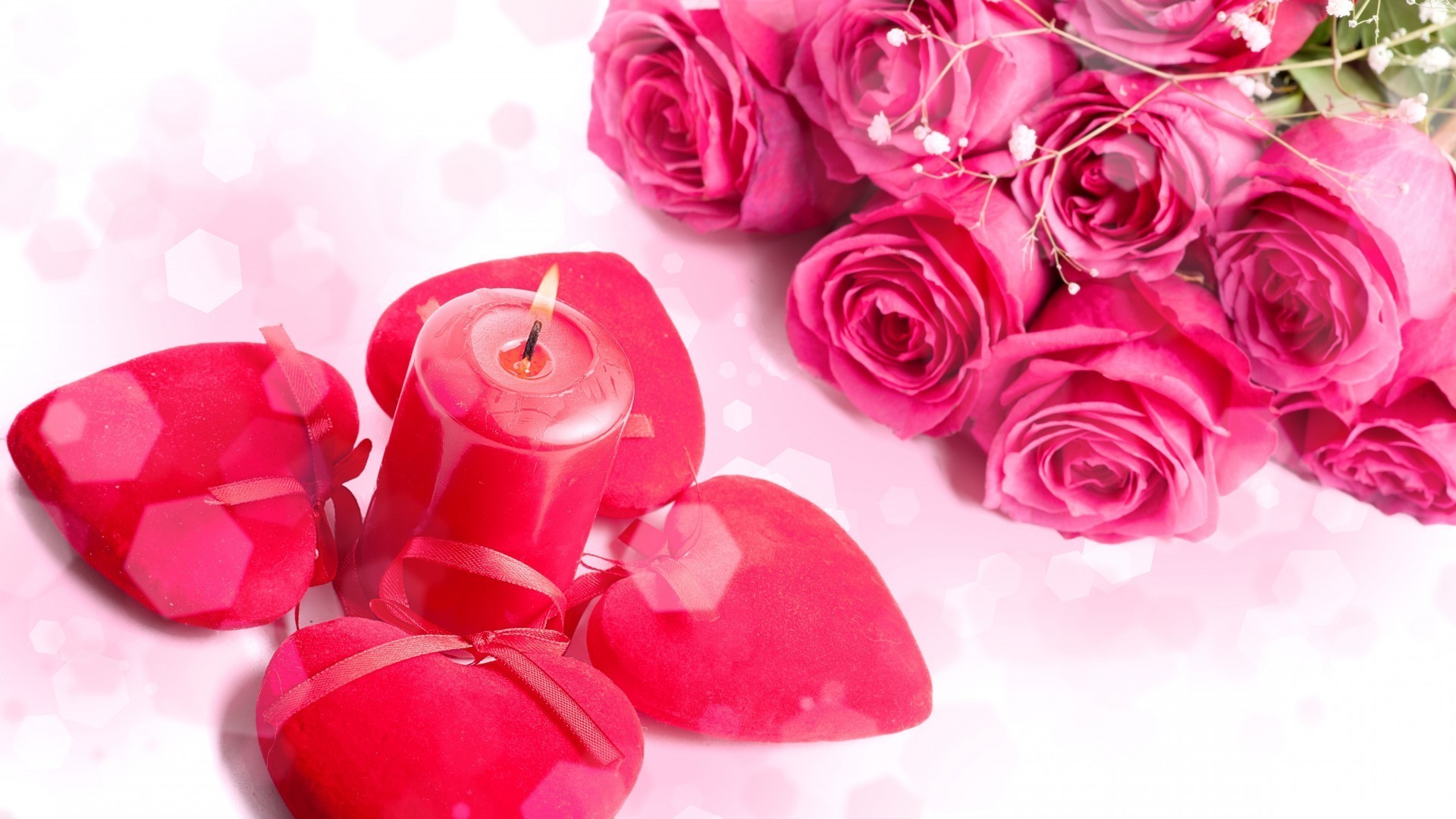 Eine rosa Kerze, die von Herzen umgeben ist. rosa Rosen