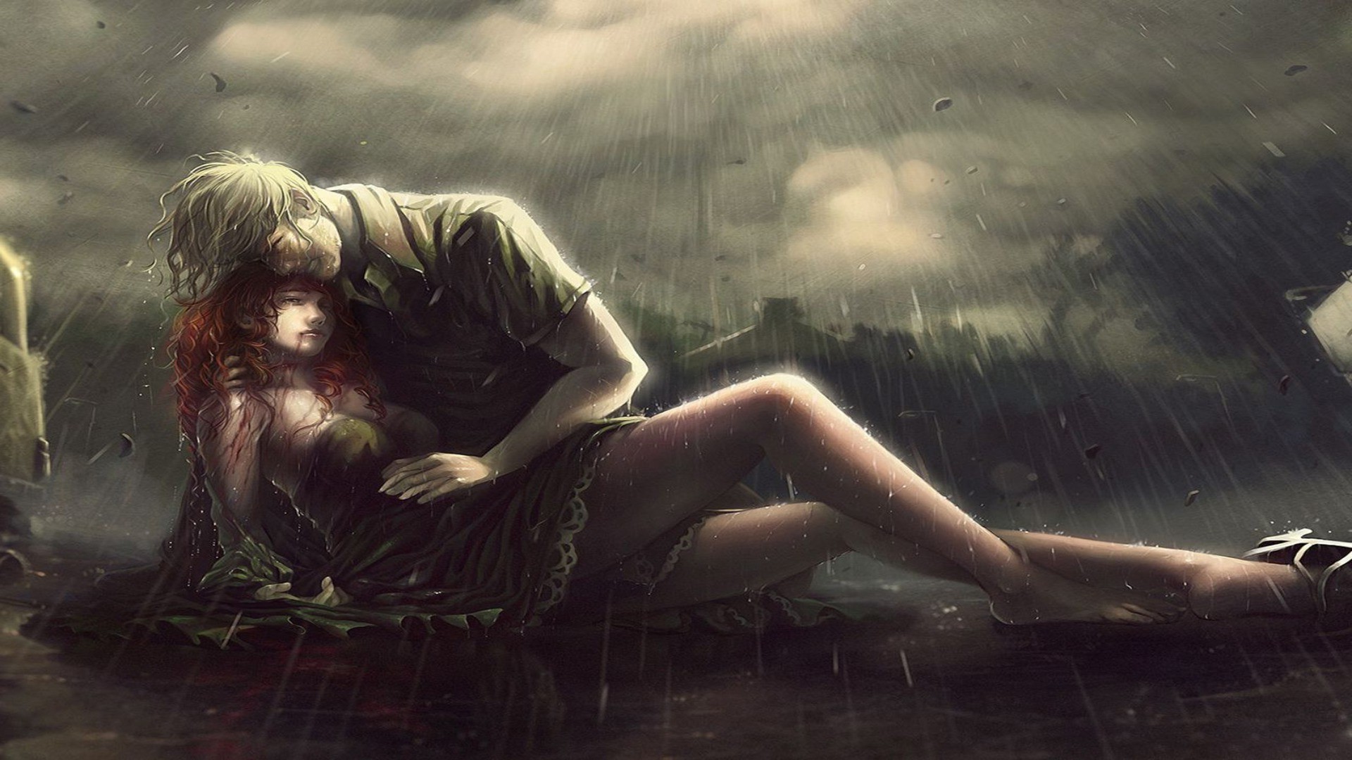 Mädchen, das in den armen eines kerls stirbt, der boden regneteMädchen, das in den Armen eines Kerls stirbt, der Boden regnete