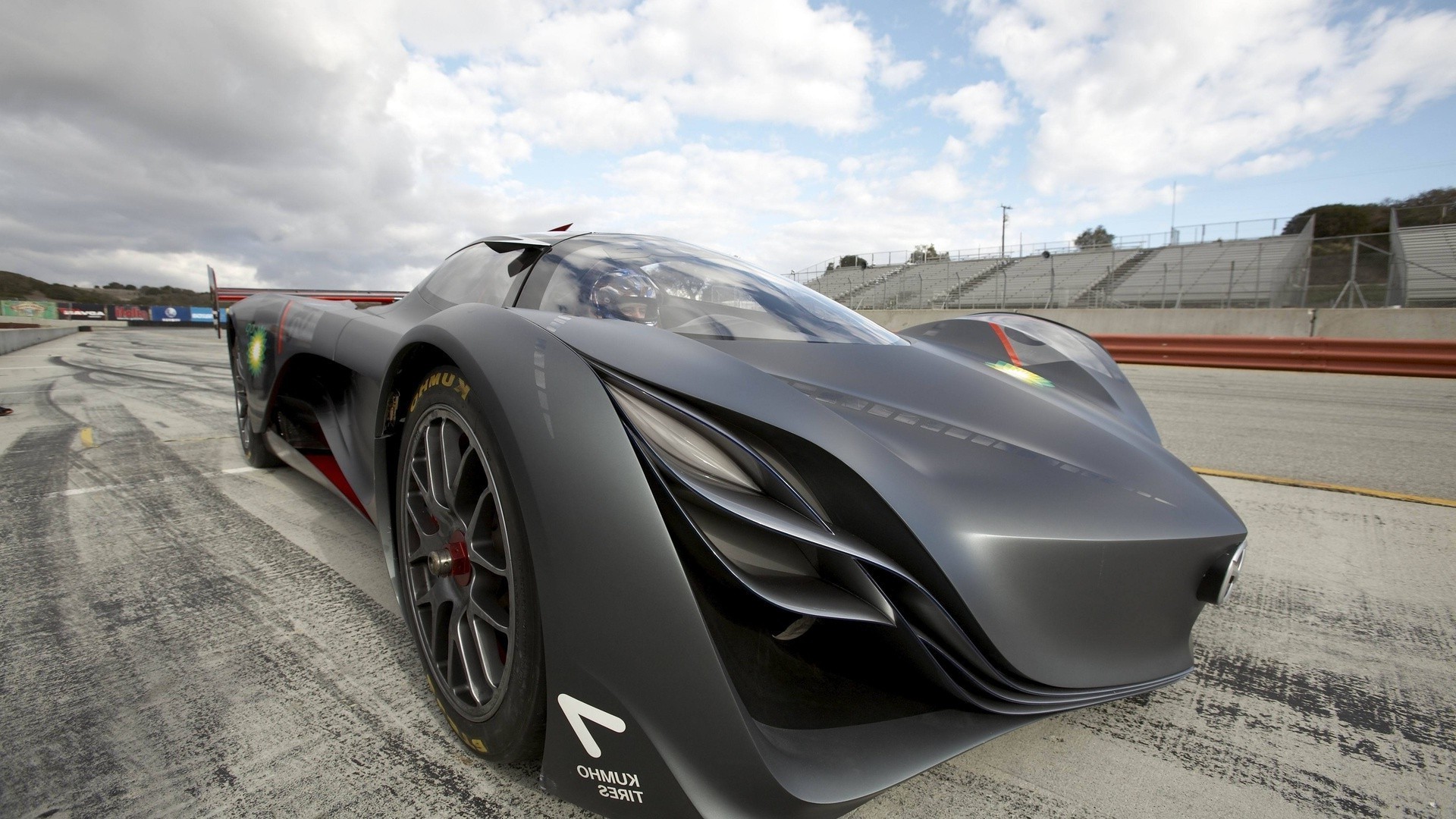 Ein mattschwarzer sportwagen auf der strecke. scheiben. räder
