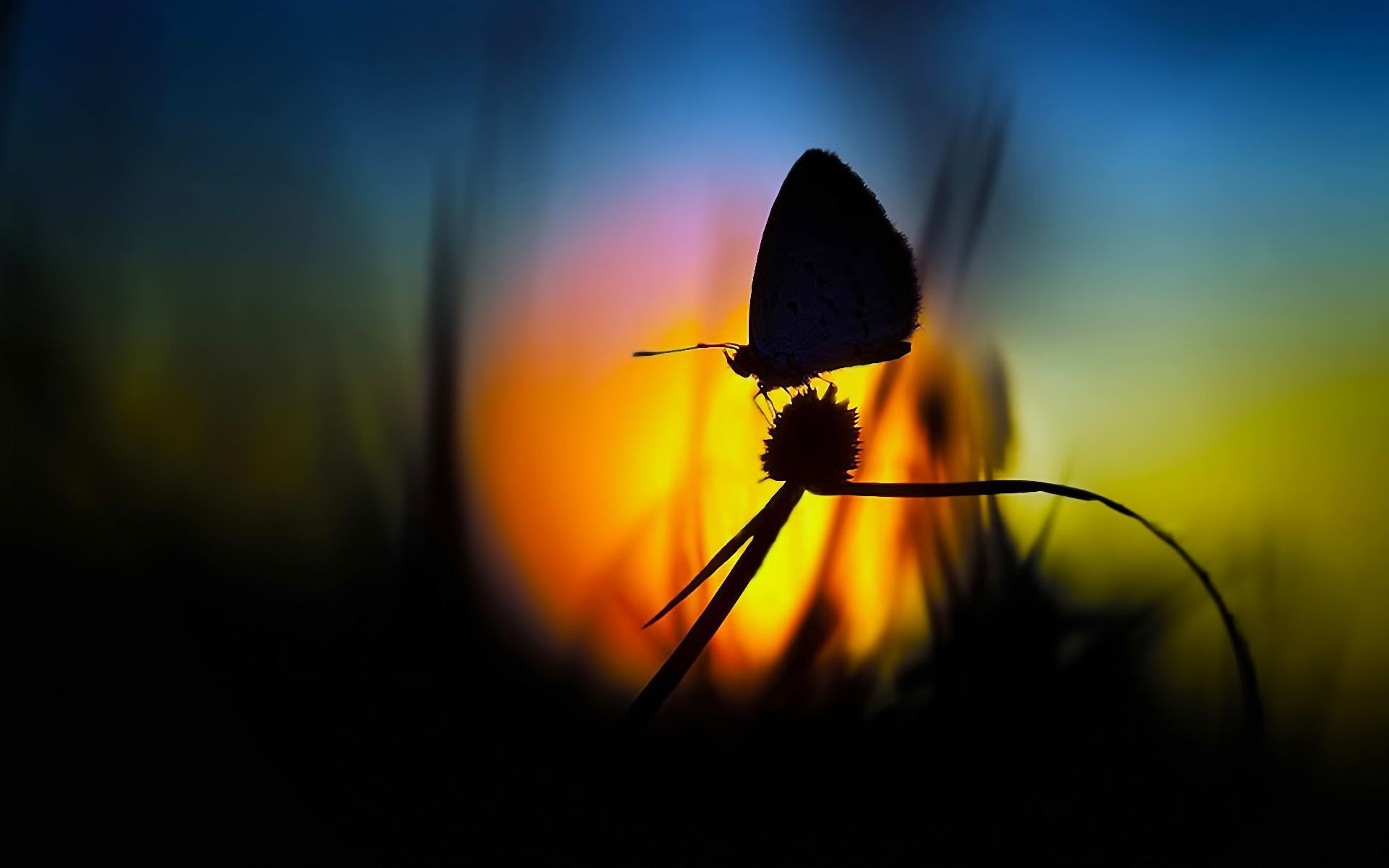 Schmetterling auf einer Blume im Hintergrund des Sonnenuntergangs