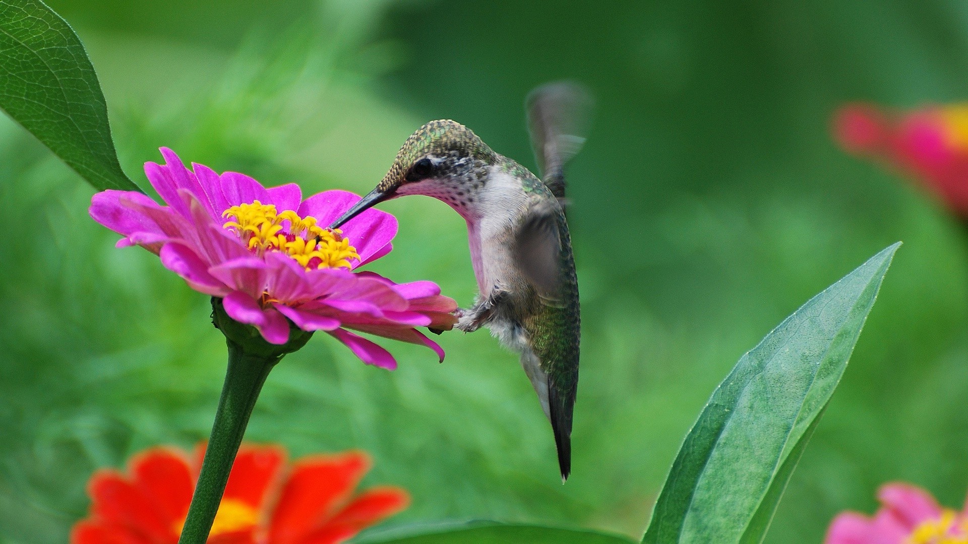 Ein kleiner Kolibri sammelt Nektar von einer rosa Blume