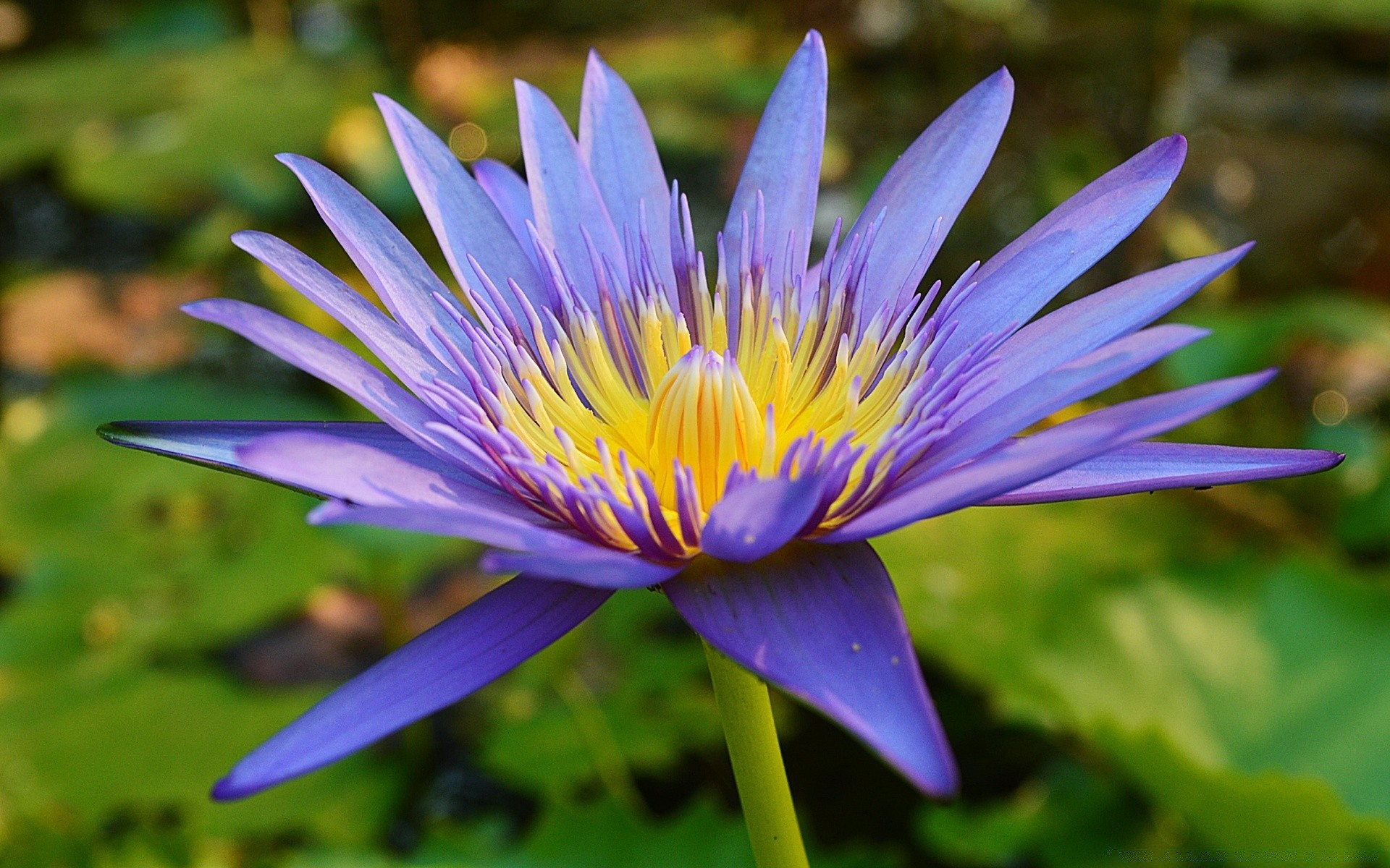 Gelb-blaue Blume in Tropfen auf schwarzem Hintergrund