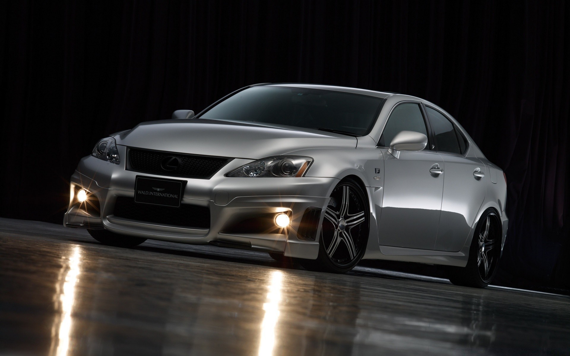 Graues Auto auf dunklem Hintergrund mit eingeschalteten Scheinwerfern