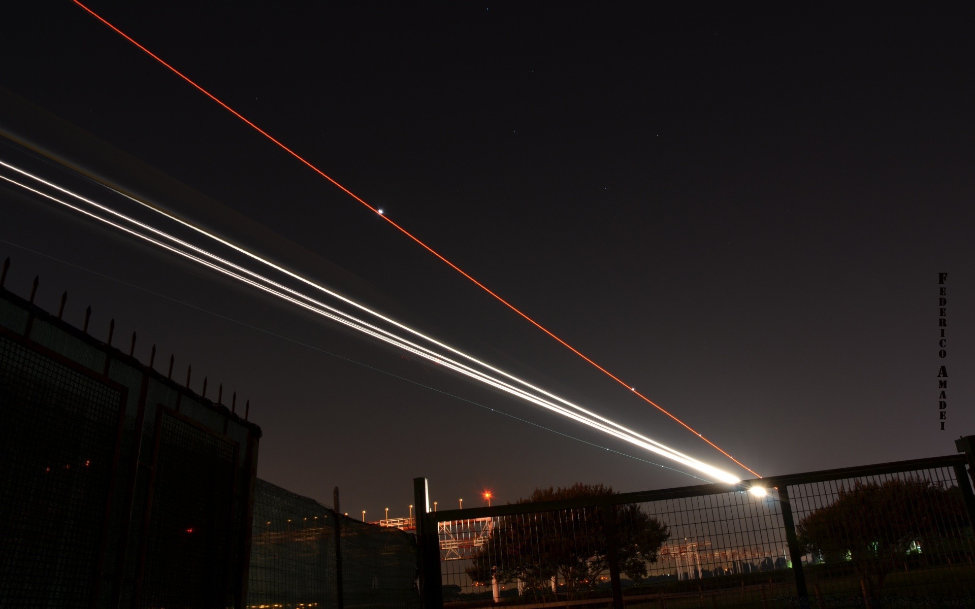 Helle, gerade Linien werden am Nachthimmel sichtbar