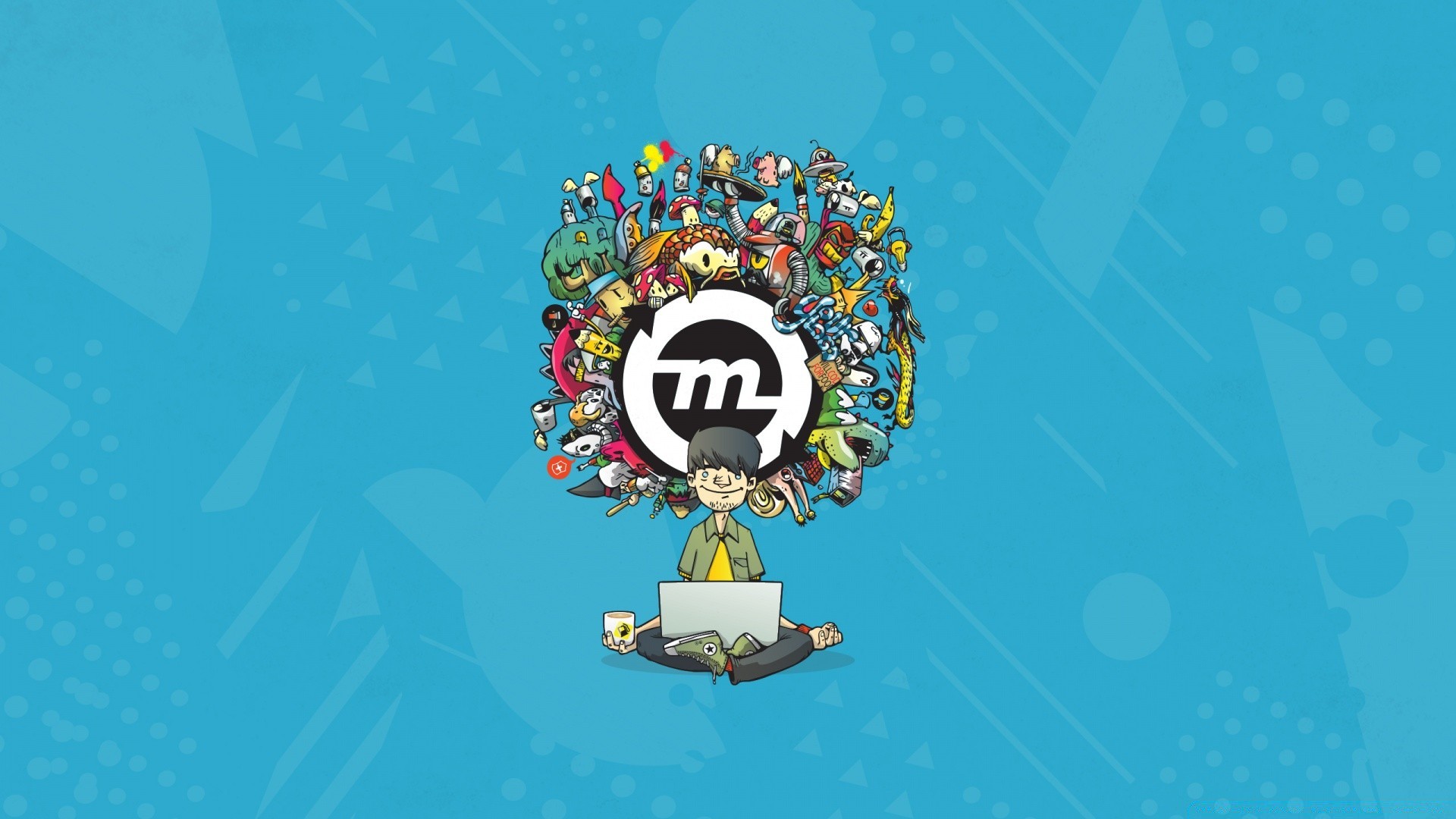 Ein cartoon-typ in turnschuhen sitzt mit einem laptop und einem becher auf einem blauen hintergrund in einer lotusposition mit einem logo über seinem kopfEin Cartoon-Typ in Turnschuhen sitzt mit einem Laptop und einem Becher auf einem blauen Hintergrund in einer Lotusposition mit einem Logo über seinem Kopf