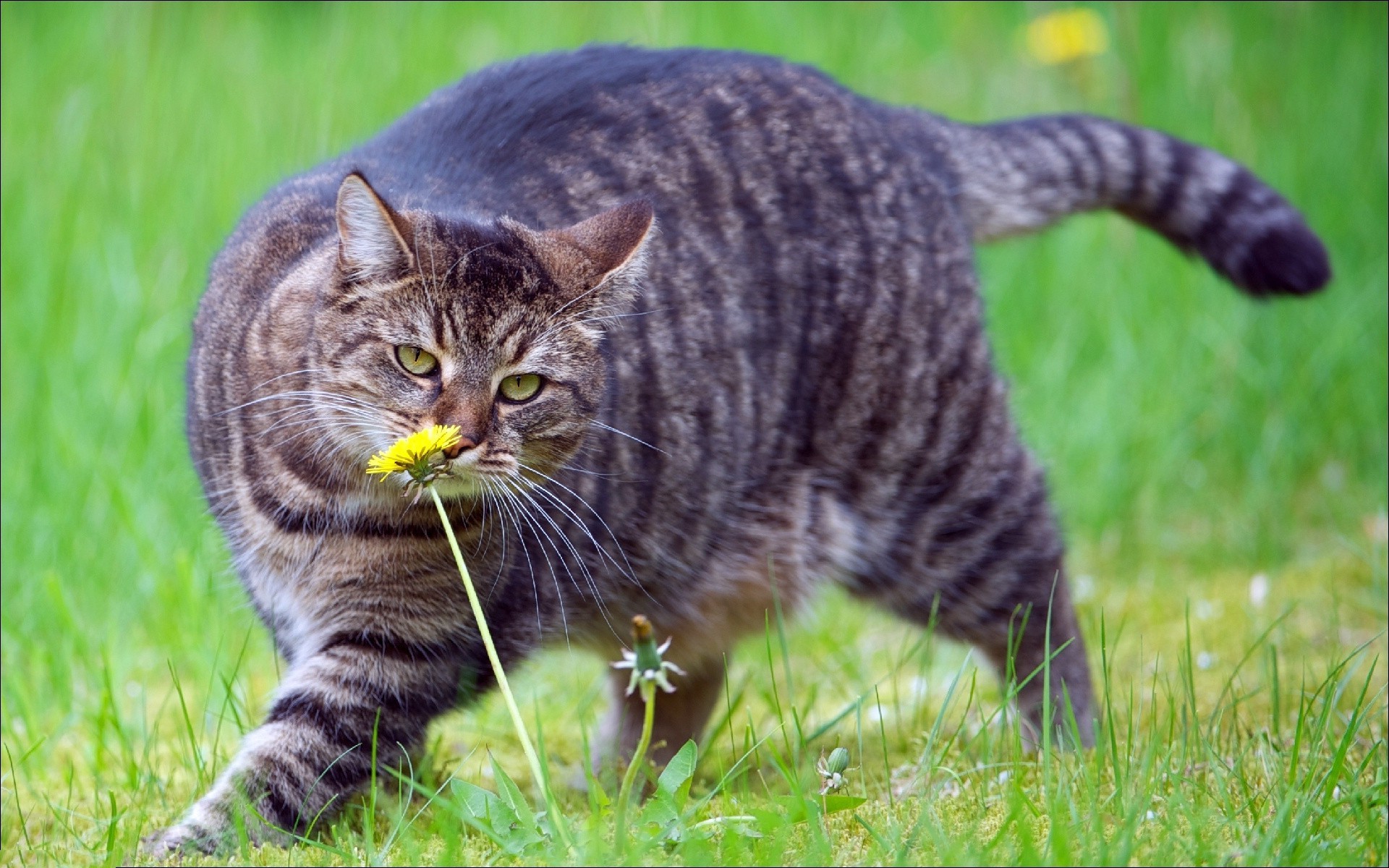 Gestreifte Katze schnüffelt Löwenzahn auf einer Lichtung