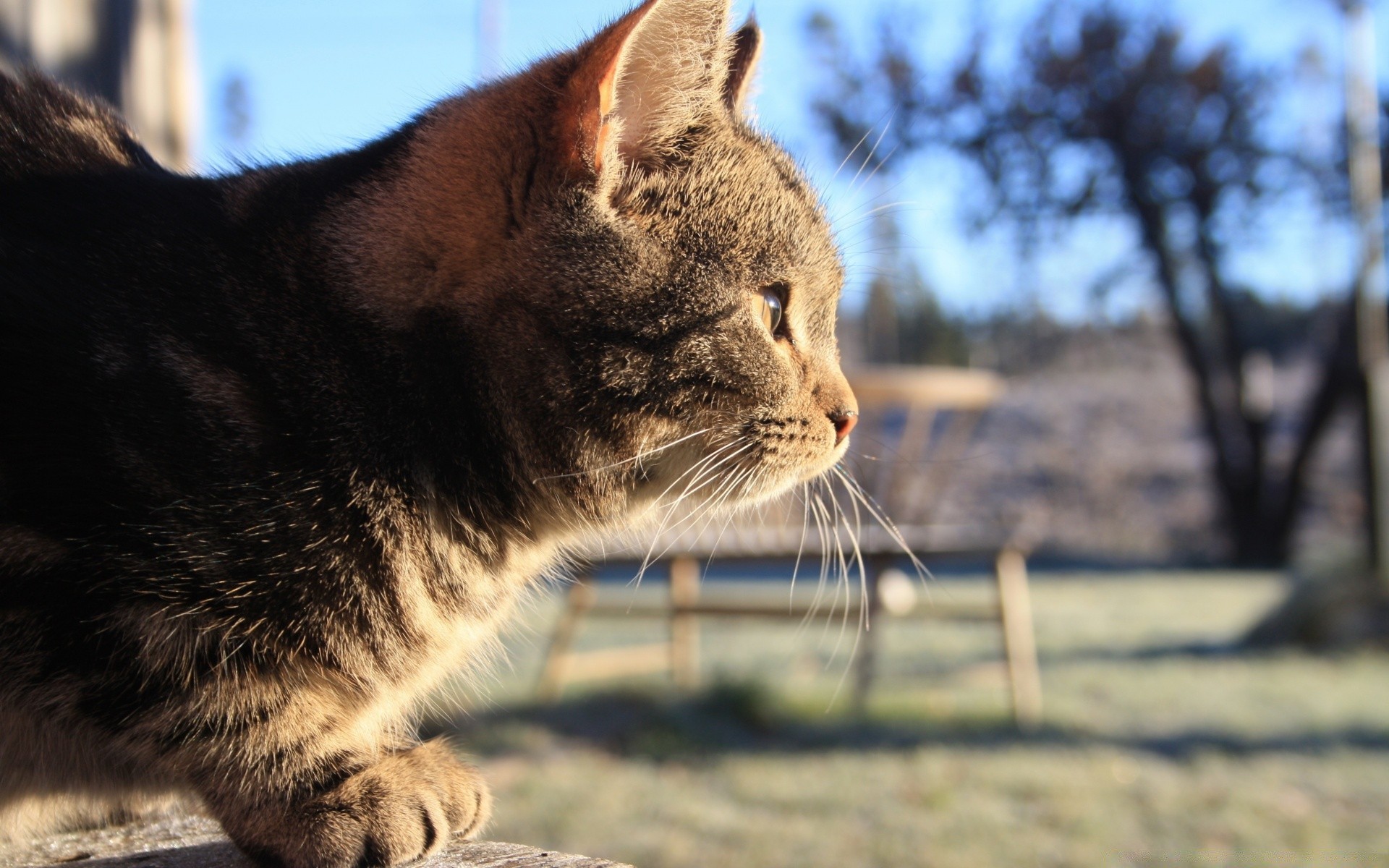 Weiße Katze schaut in die Ferne zum Sonnenuntergang