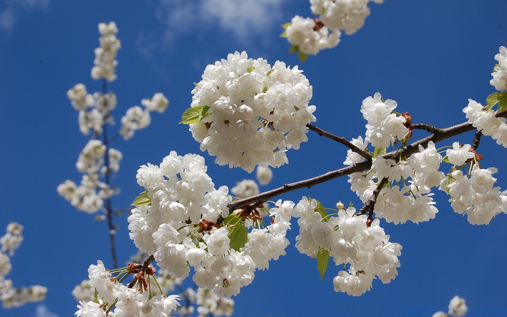 Blühende weiße Bäume auf einem blauen Himmelshintergrund