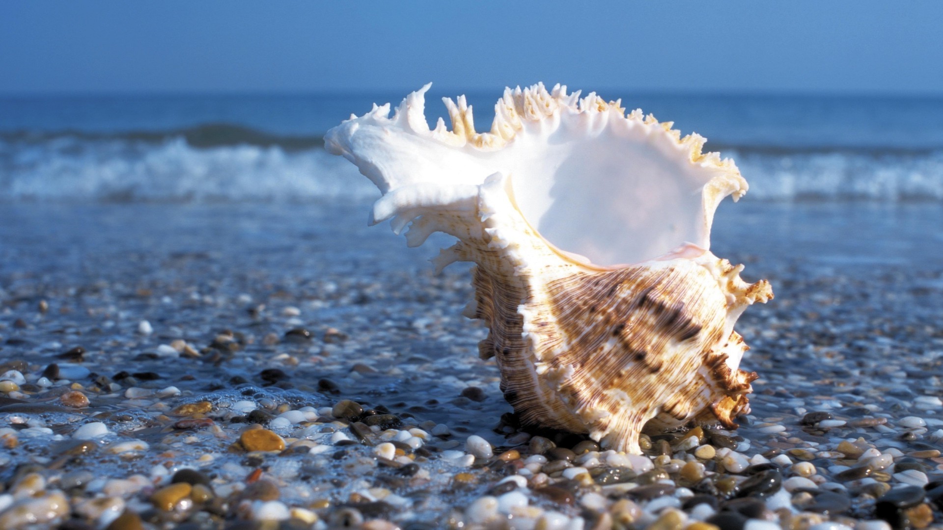 Schöne Muschel vor dem Hintergrund des grenzenlosen Ozeans