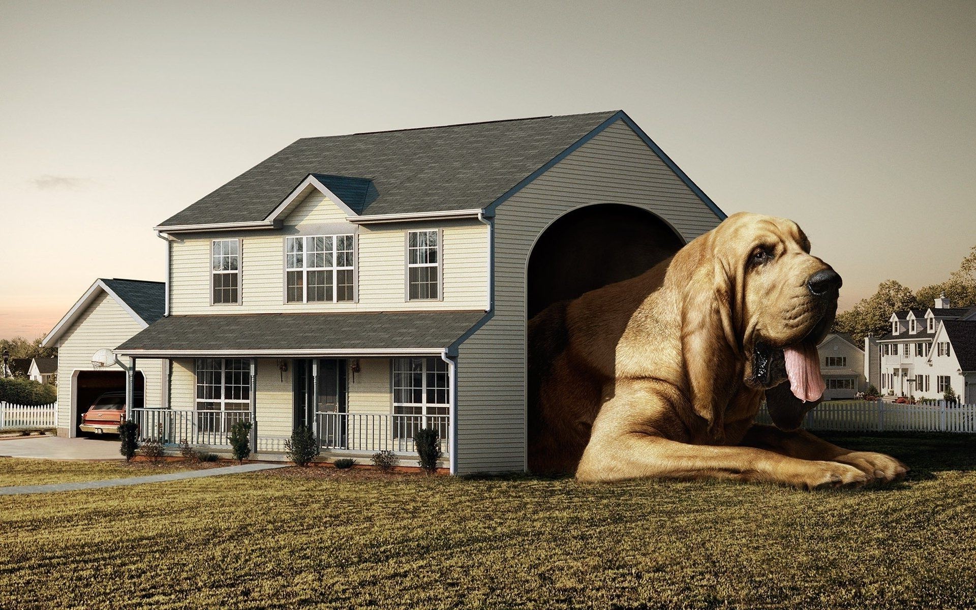 Der Hund liegt auf dem Rasen in der Natur und posiert