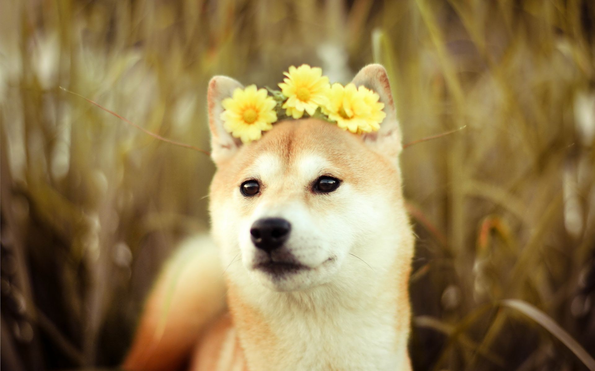 Süßes Hündchen mit gelben Blüten zwischen den Ohren