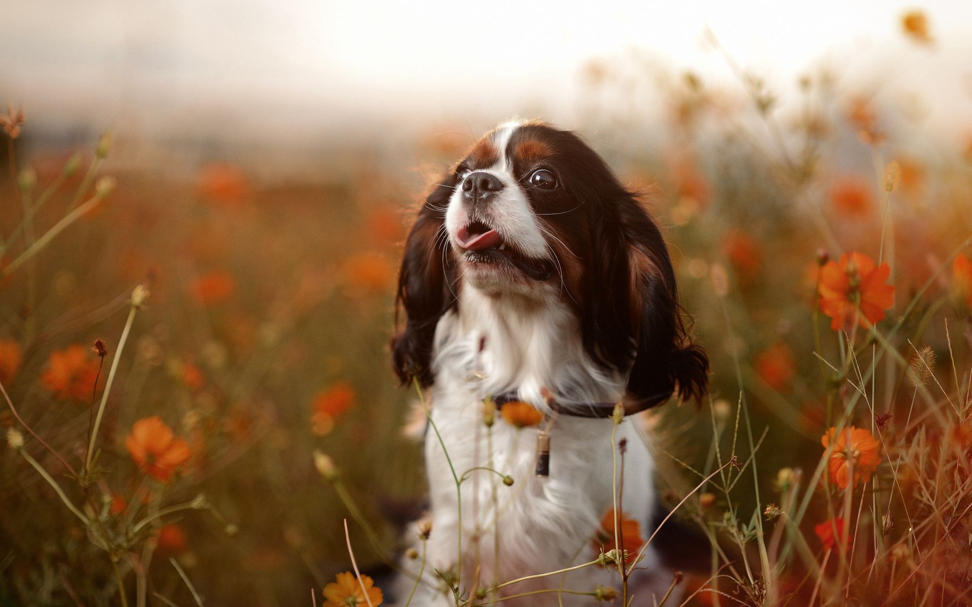 Hund auf dem Feld mit roten Mohnblumen