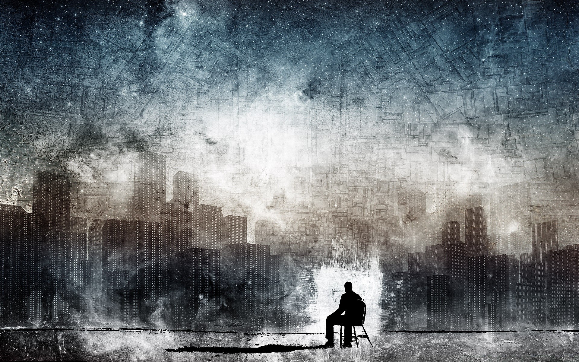 Ein mann schaut steht auf dem eis und schaut auf einen riesigen planetenEin Mann schaut steht auf dem Eis und schaut auf einen riesigen Planeten