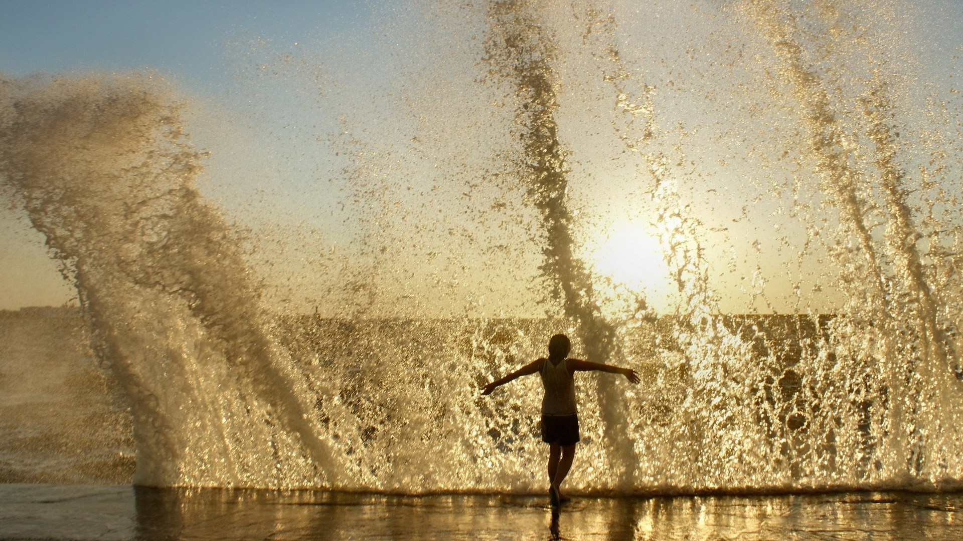 Mann läuft am strand herum und spritzt in der näheMann läuft am Strand herum und spritzt in der Nähe