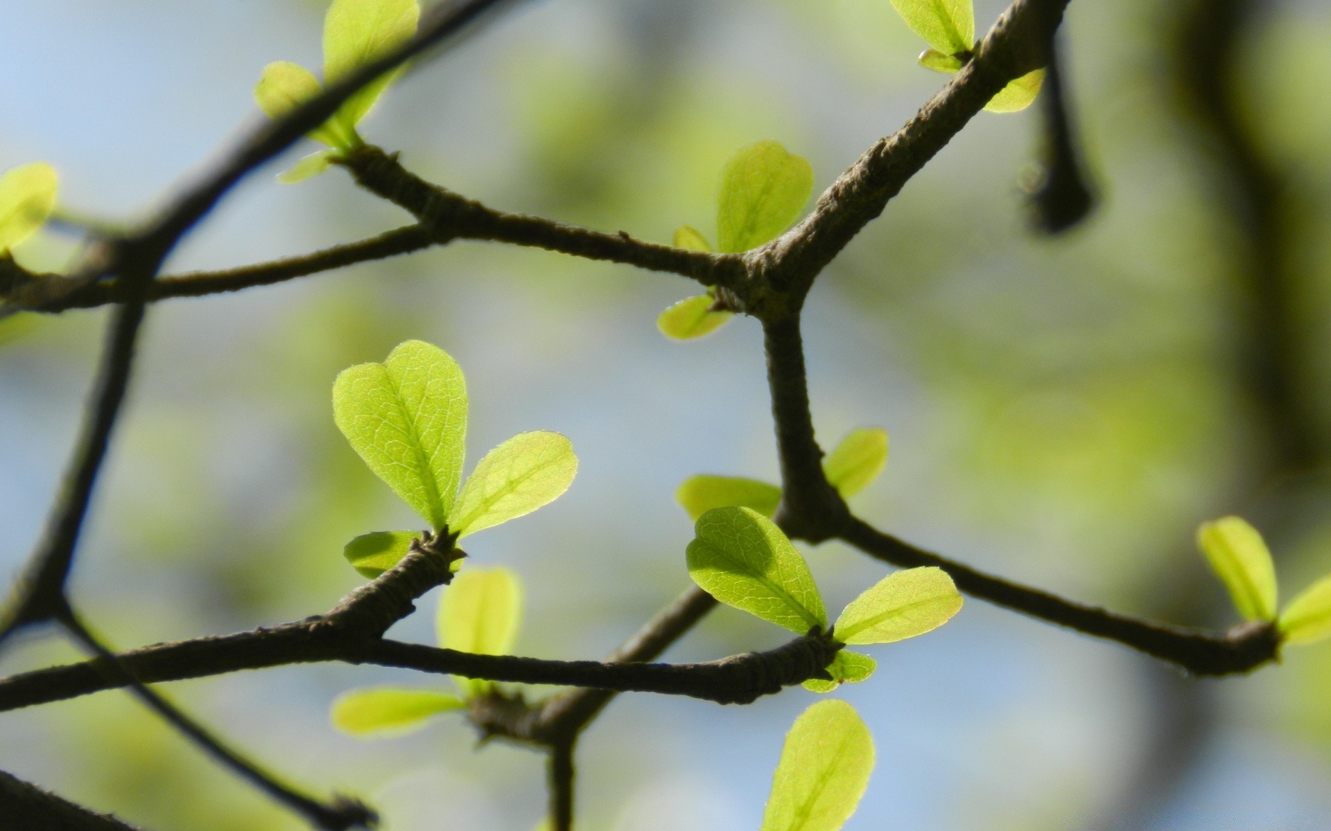 Makro von Blättern auf einem Ast auf einem unscharfen Hintergrund