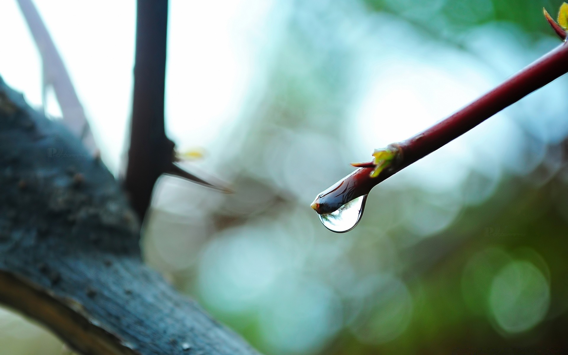 Tautropfen auf einem ast in einem verschwommenen waldTautropfen auf einem Ast in einem verschwommenen Wald