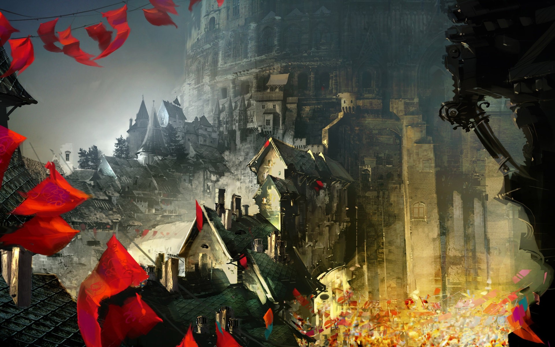Ein düsteres Dorf hängt rote Fahnen