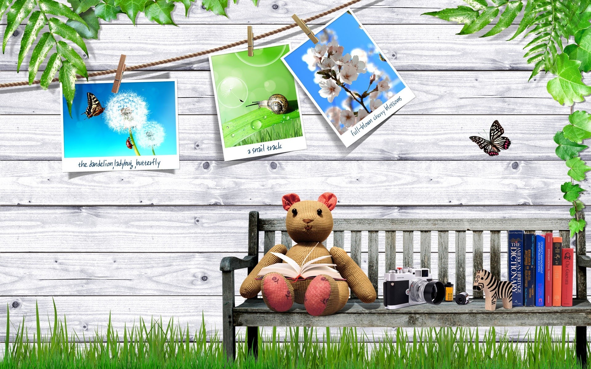 Spielzeug auf einer Bank und ein Foto entlang der Wand