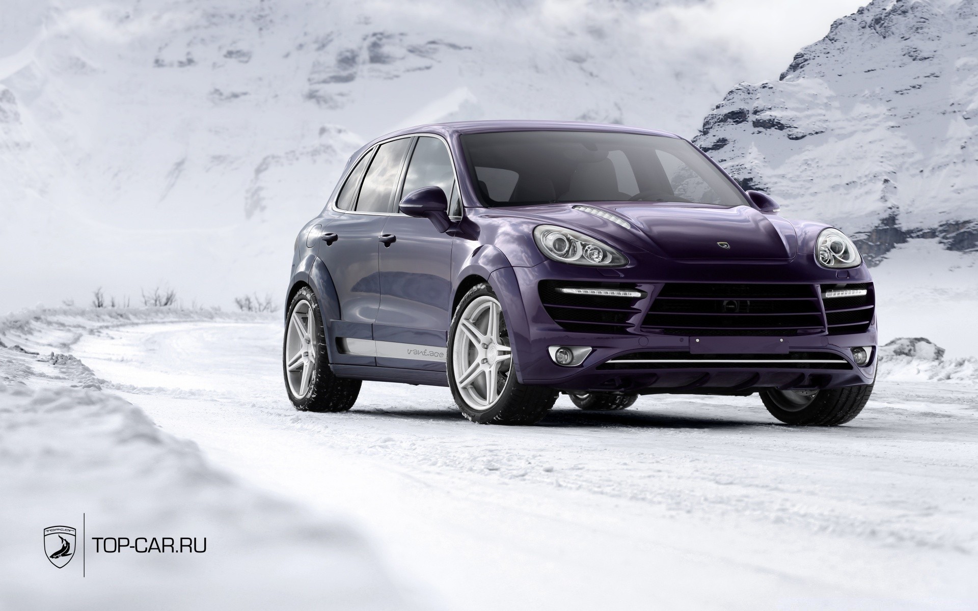 Lila Auto auf dem Hintergrund der schneebedeckten Berge