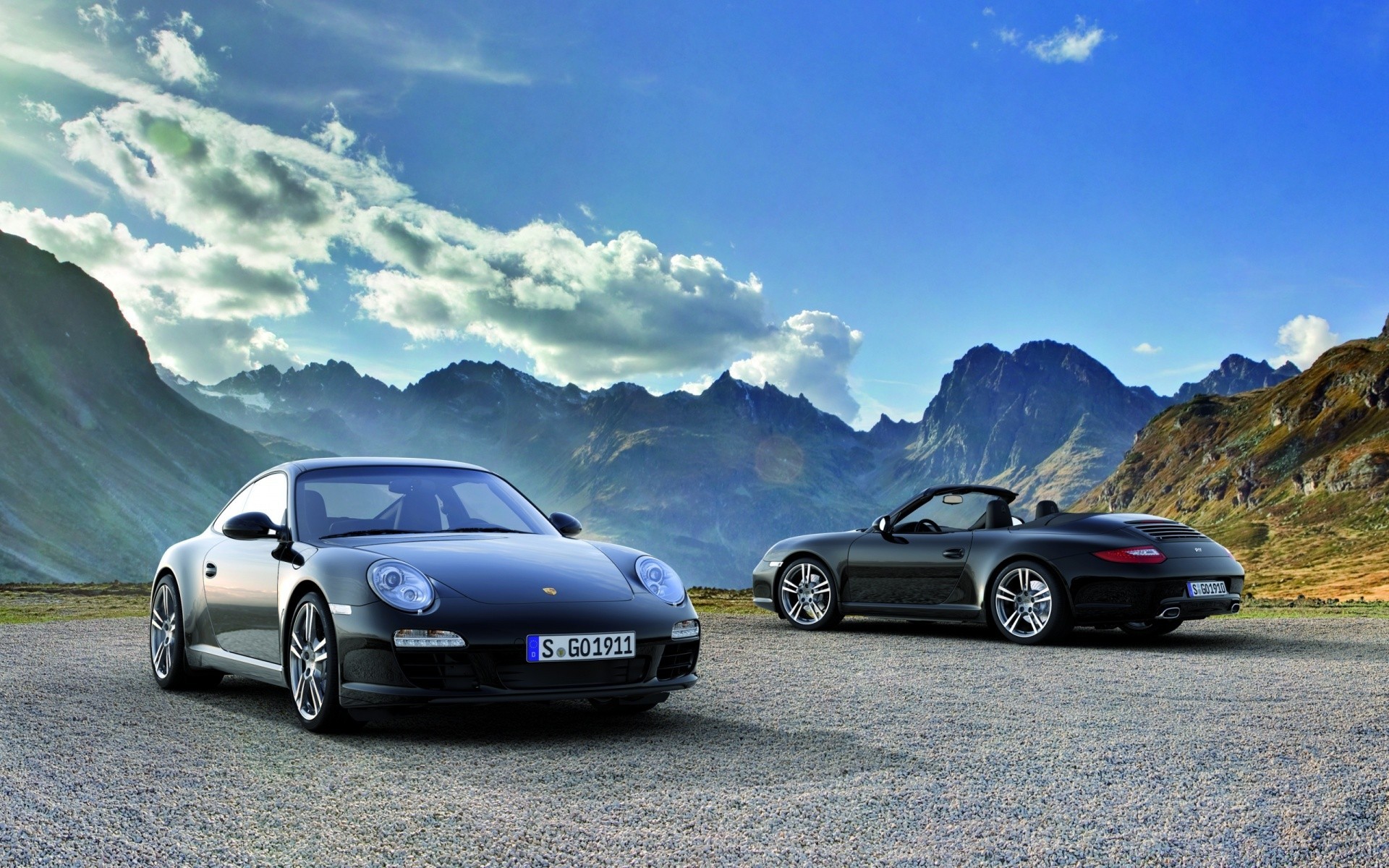 Neue Autos werden auf dem Asphalt vor der Kulisse der Berge geparkt