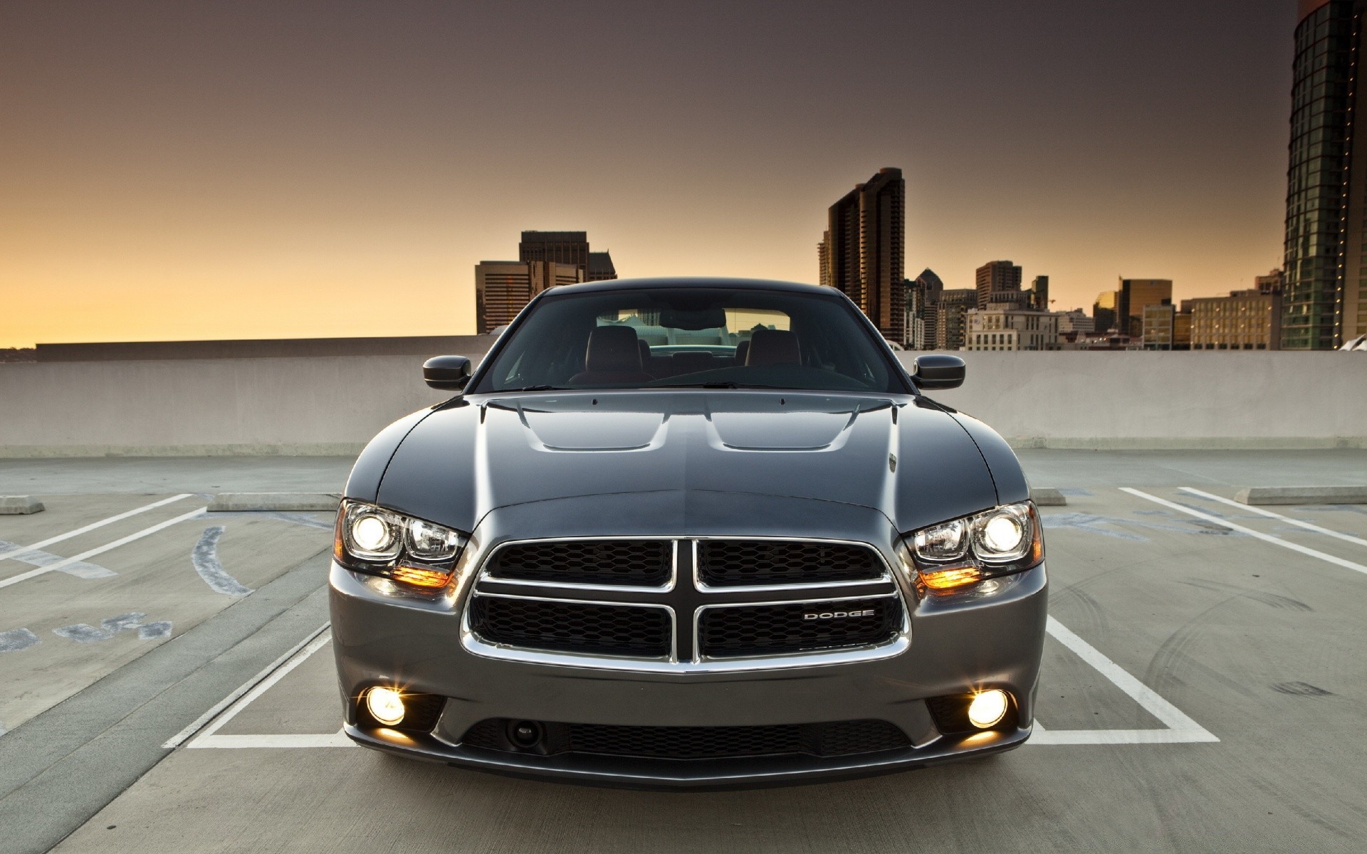 Ein blaues auto steht auf grauem asphalt vor dem hintergrund von hochhäusernEin blaues Auto steht auf grauem Asphalt vor dem Hintergrund von Hochhäusern