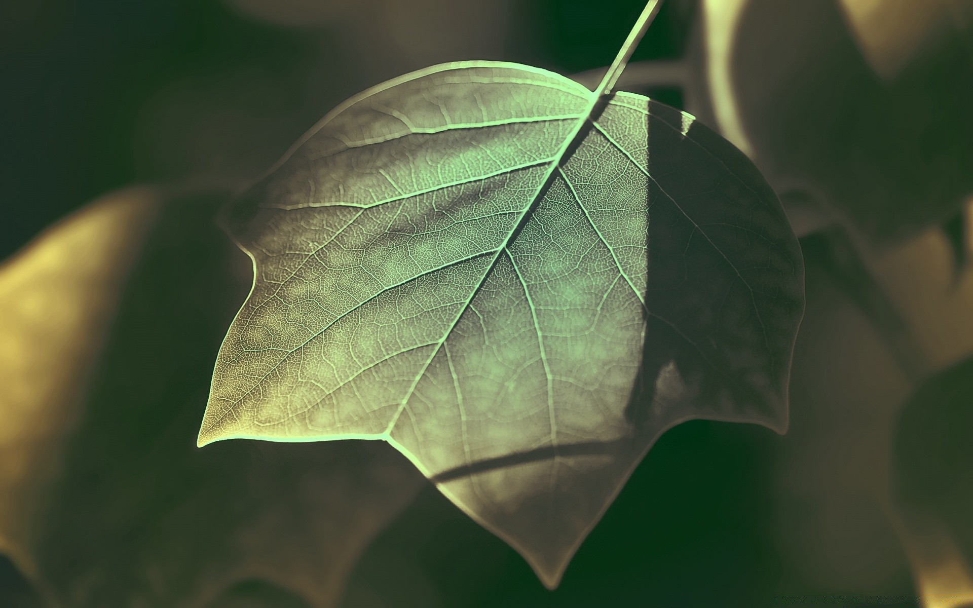 Grün-gelbes blatt auf verschwommenem grünem hintergrund