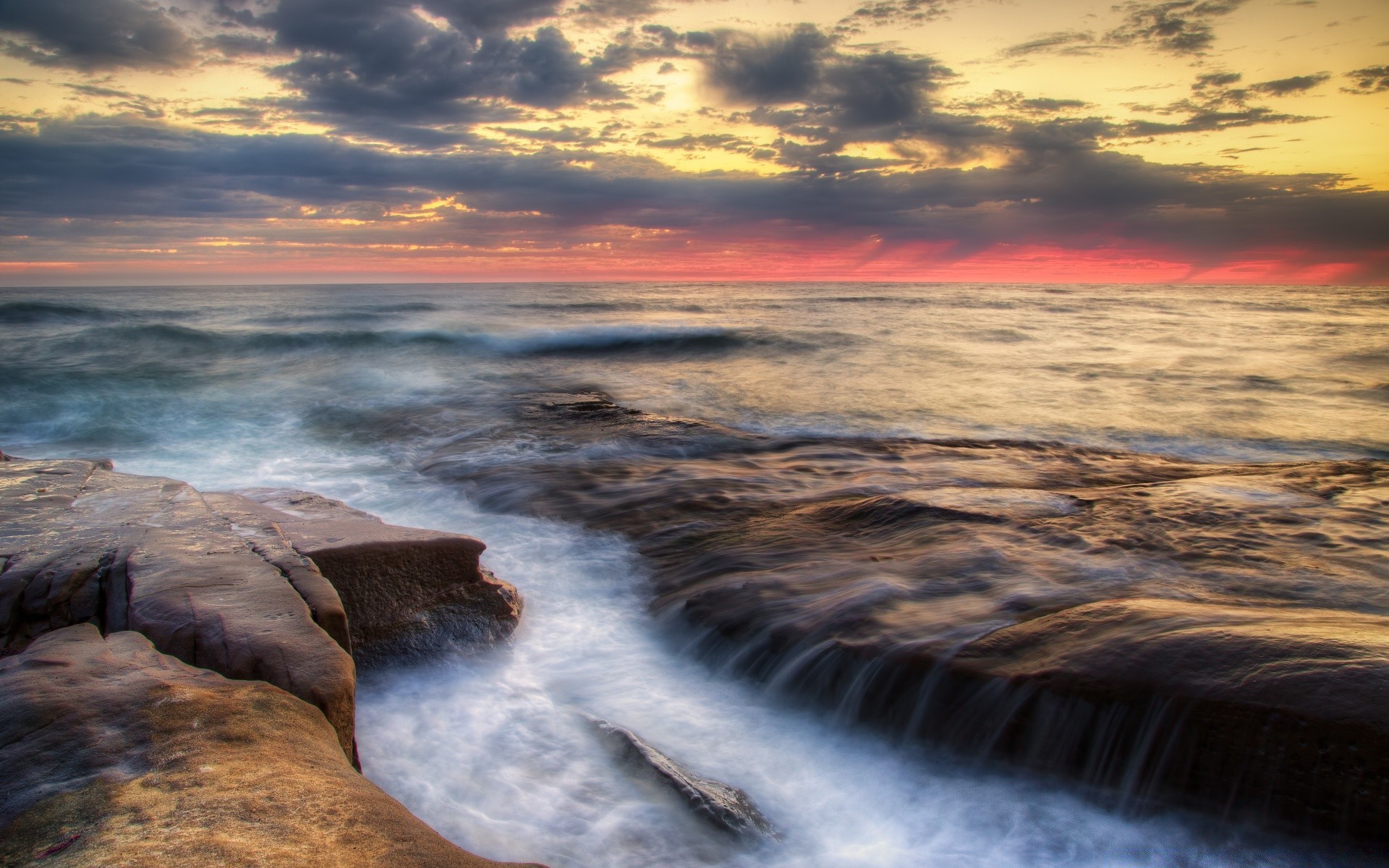 Sonnenuntergang am meer mit häusern auf den felsenSonnenuntergang am Meer mit Häusern auf den Felsen