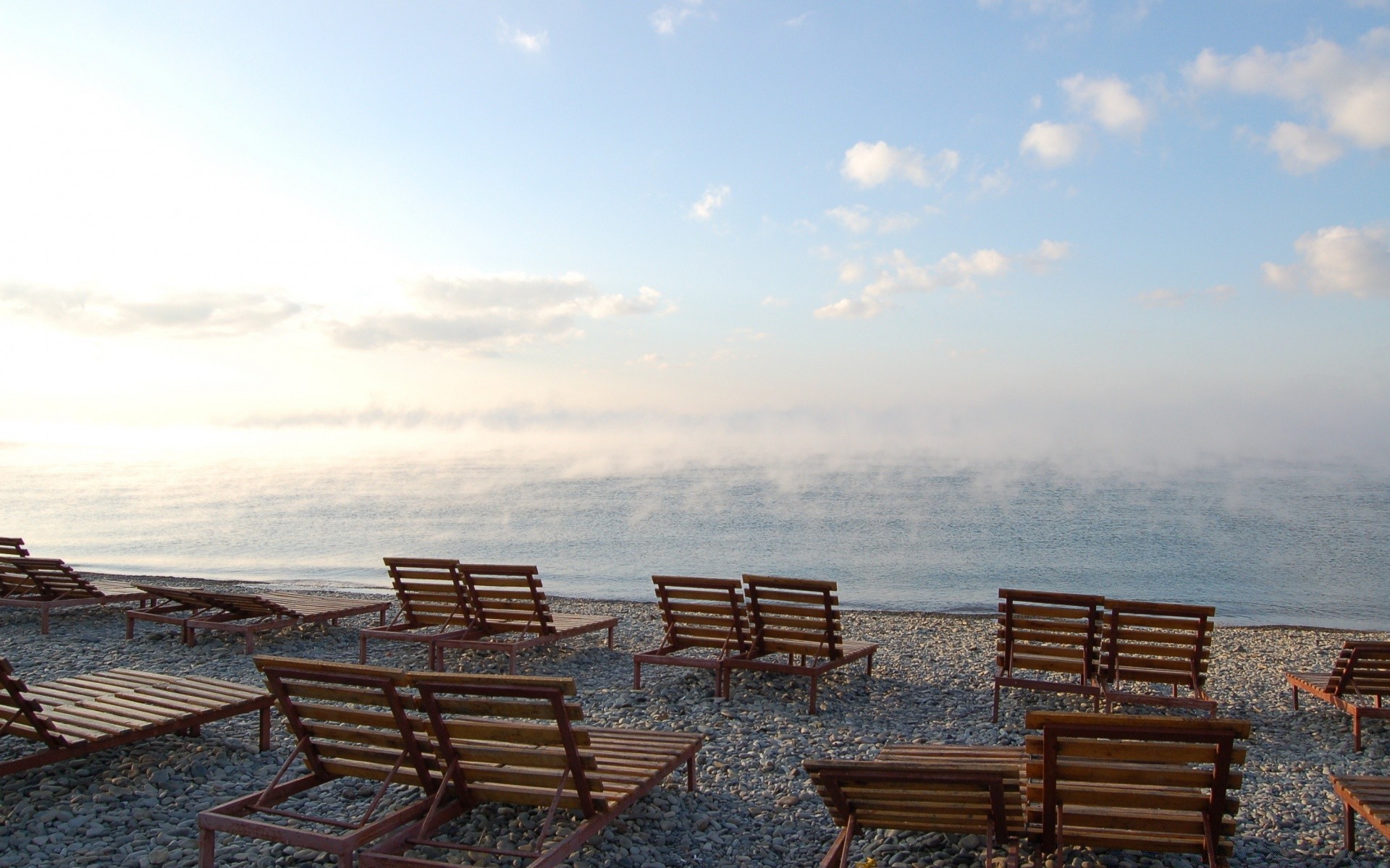 Landschaft mit Brücke. ein klarer Himmel. Blaues Meer
