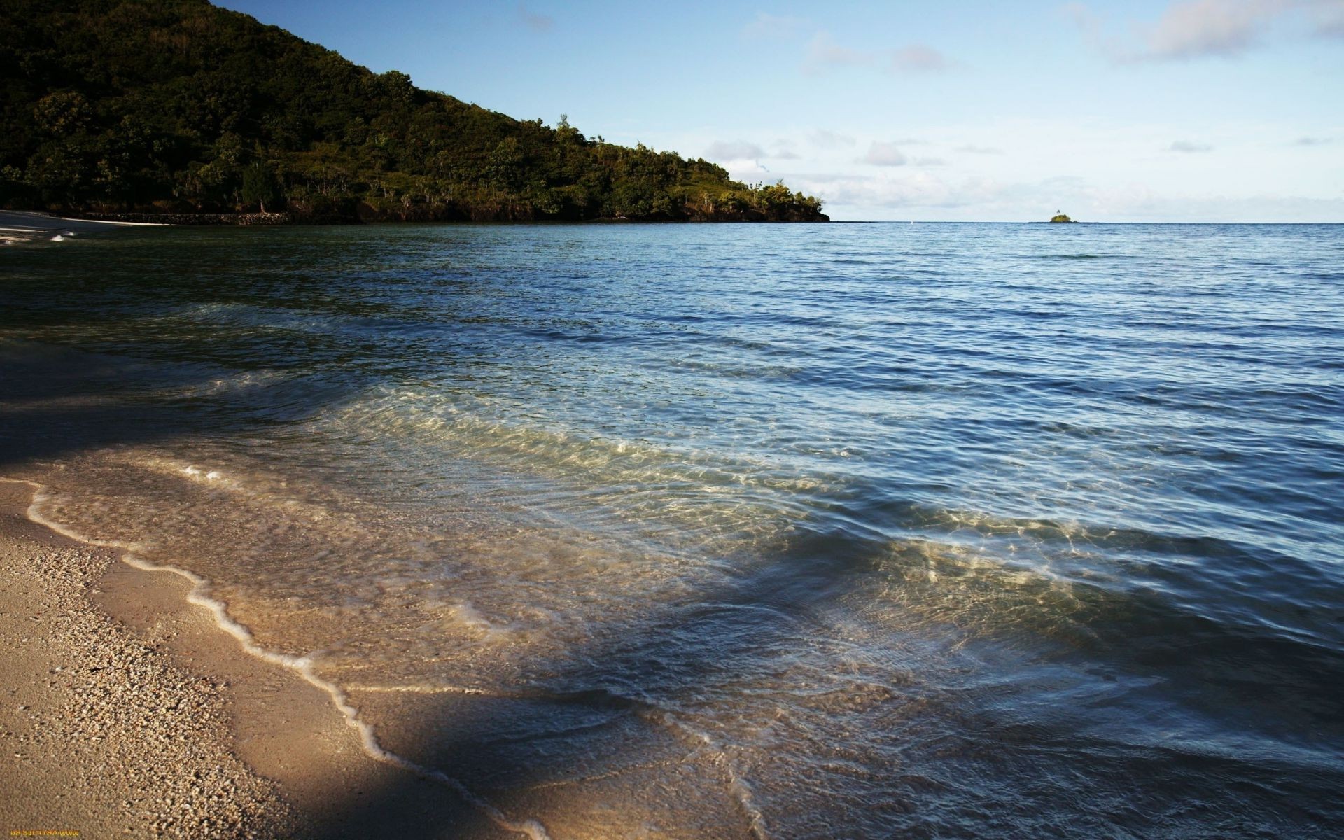 Strand am Meer auf dem Hintergrund eines sanften Berges