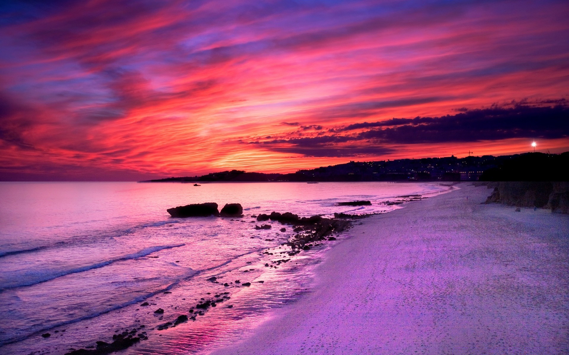 Rosa Sonnenuntergang am blauen Himmel über dem Meer