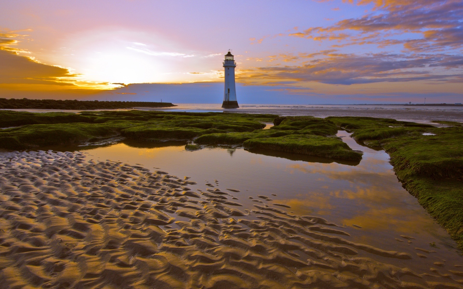 Ein einsamer leuchtturm, der bei sonnenuntergang von wasser und grüner vegetation umgeben istEin einsamer Leuchtturm, der bei Sonnenuntergang von Wasser und grüner Vegetation umgeben ist