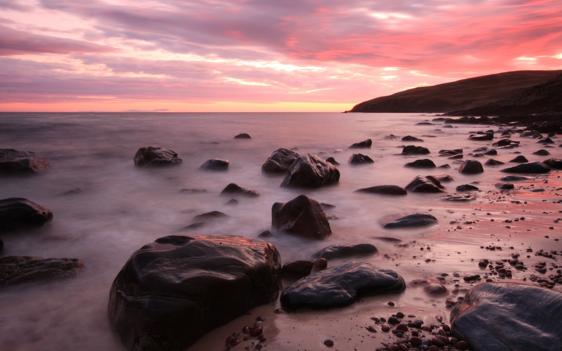 Sonnenuntergang vor dem hintergrund des meeres und der bergeSonnenuntergang vor dem Hintergrund des Meeres und der Berge
