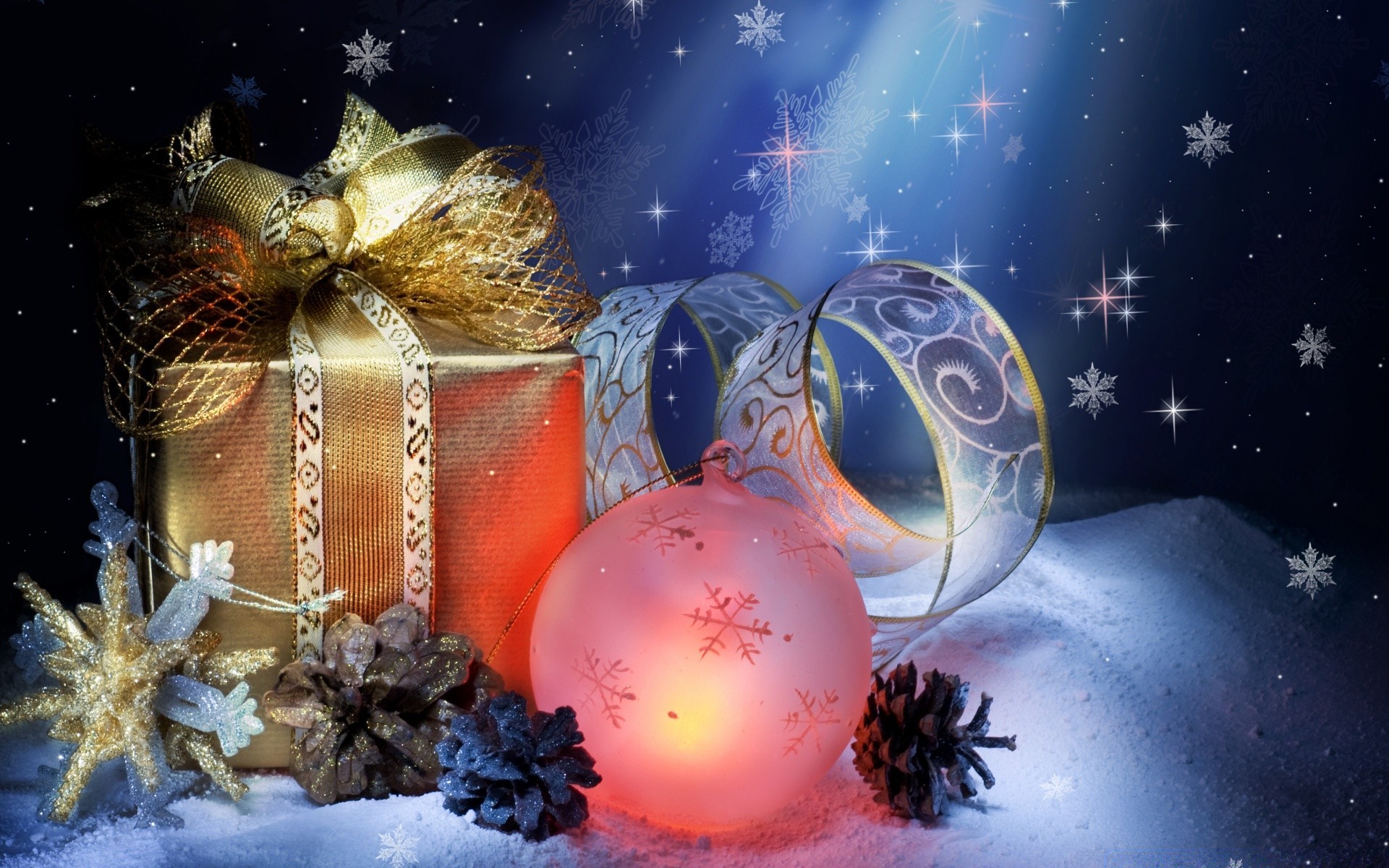 Weihnachtskugeln und Tannenzapfen im Schnee