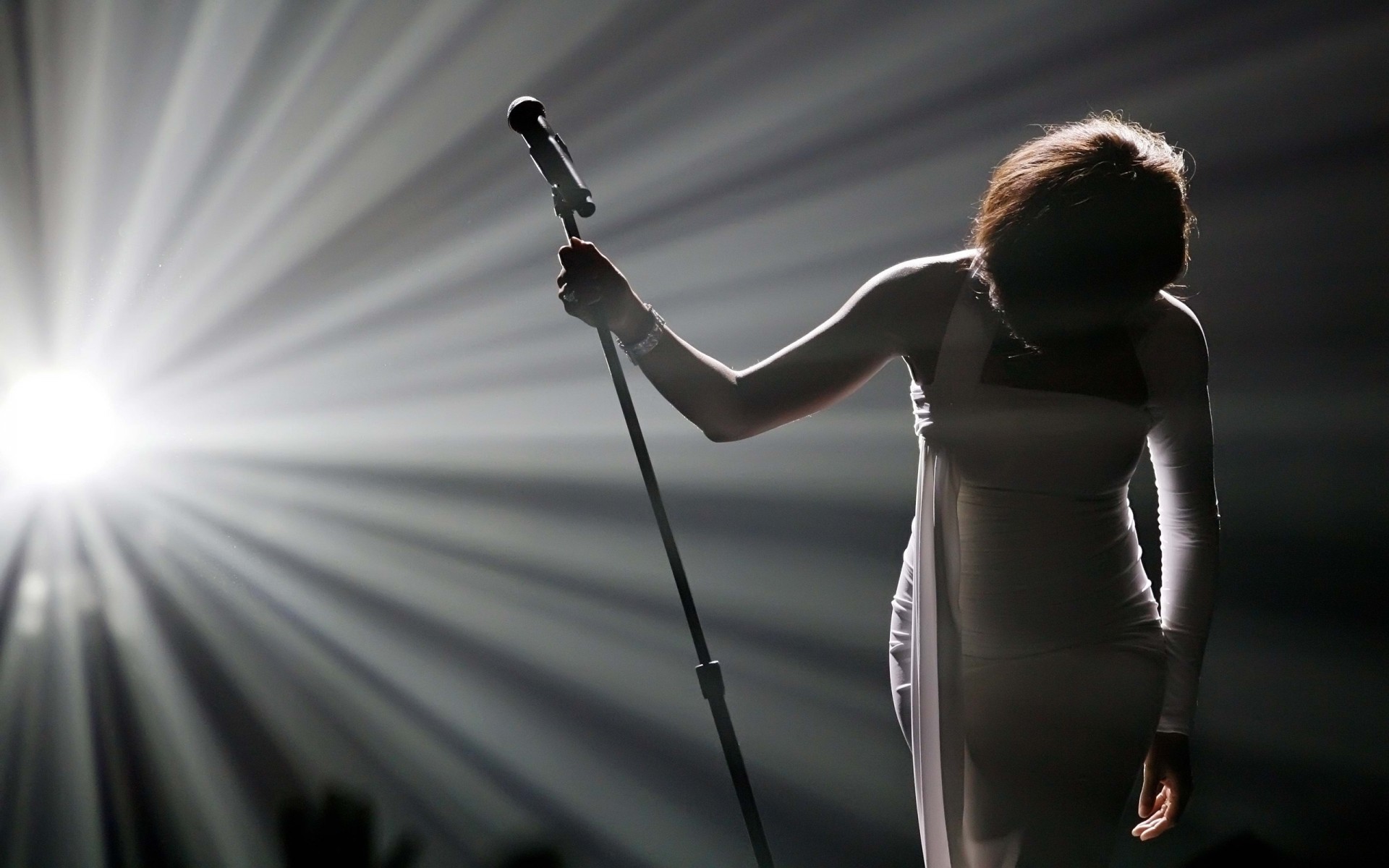 Dunkelhaarige Sängerin im hellen Kleid auf der Bühne mit Mikrofon in der Hand
