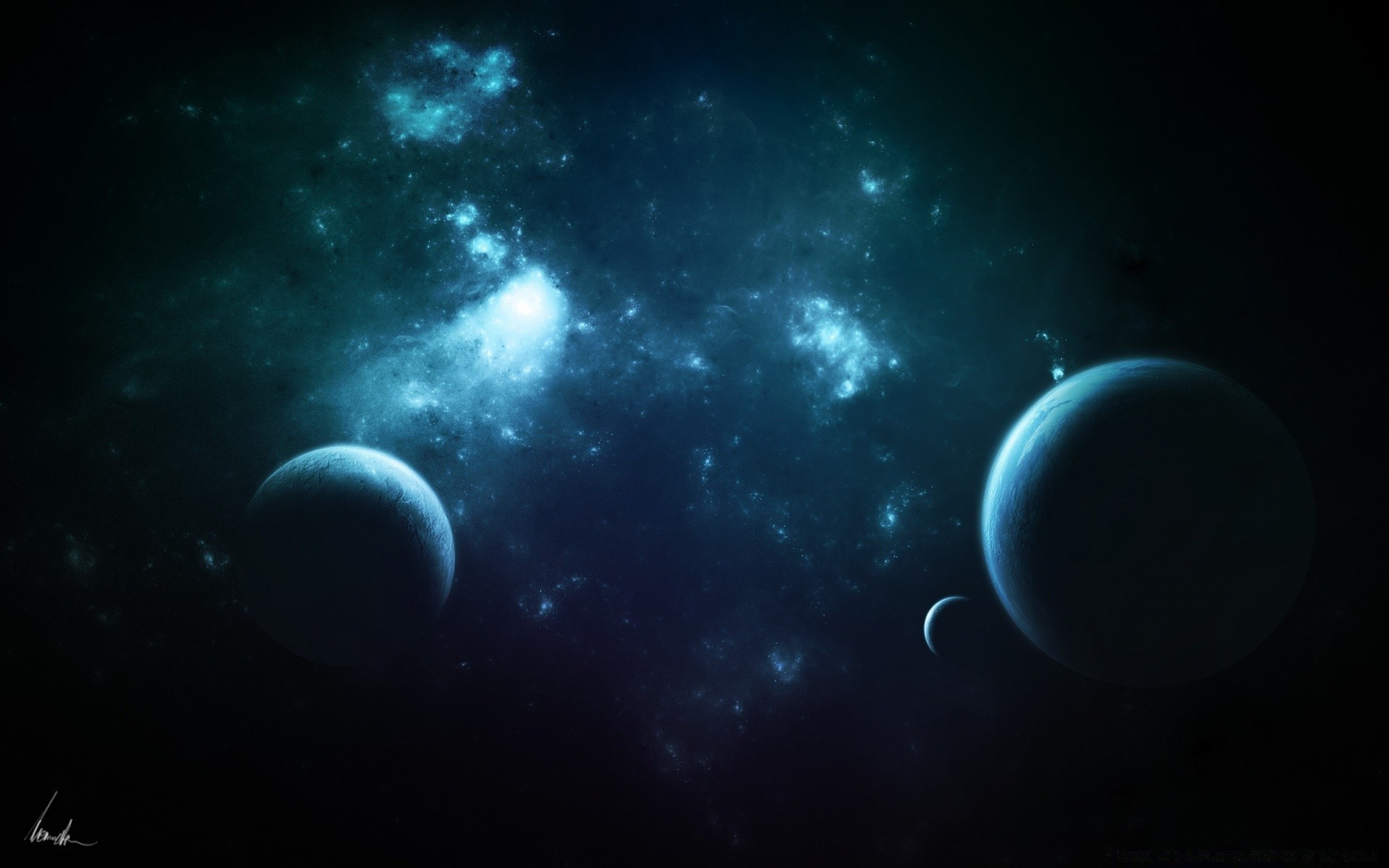 Planeten in einer kosmischen galaxie auf dunklem hintergrundPlaneten in einer kosmischen Galaxie auf dunklem Hintergrund