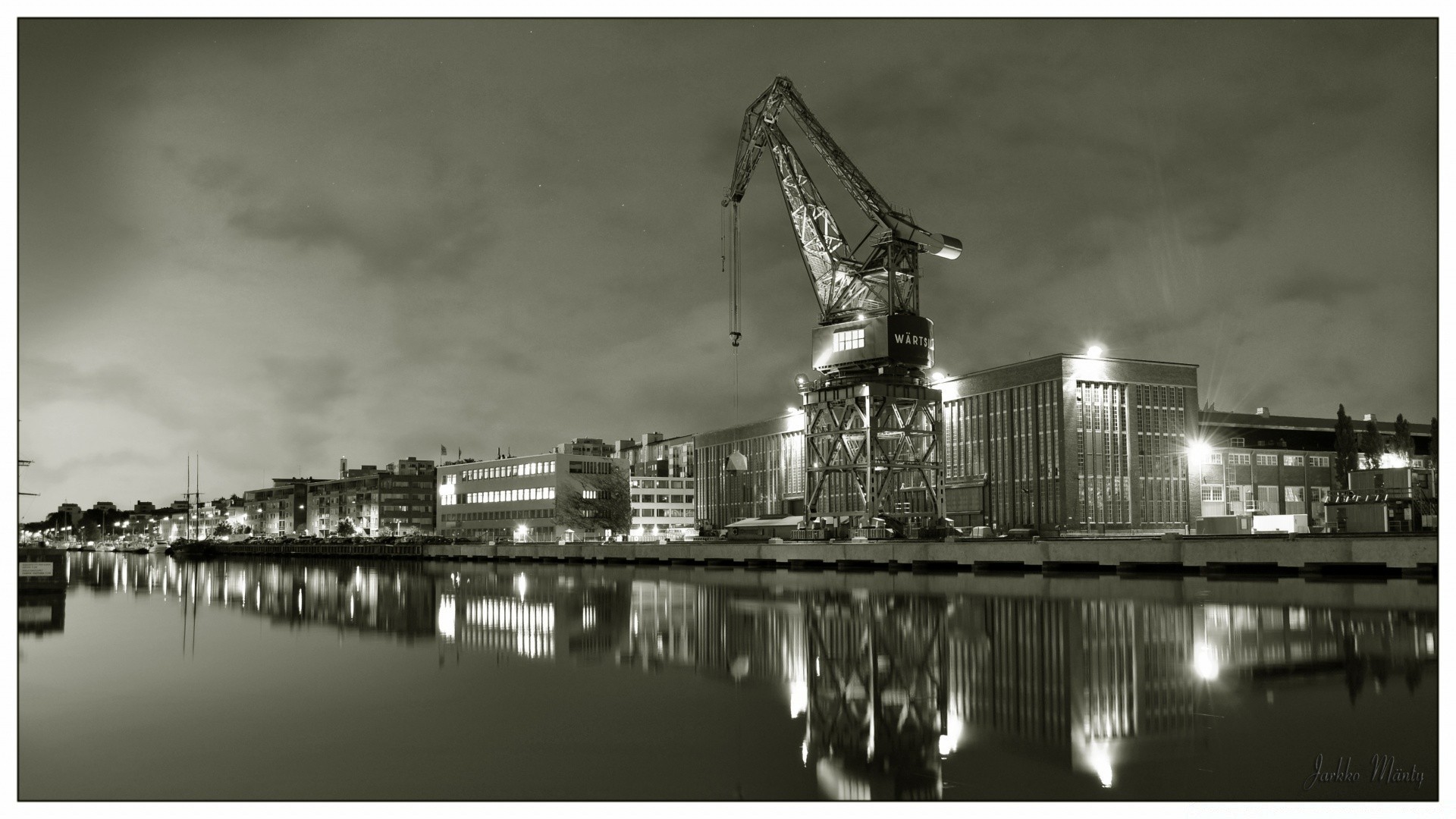 Der Fluss. Städtische Bebauung. Marine Kräne